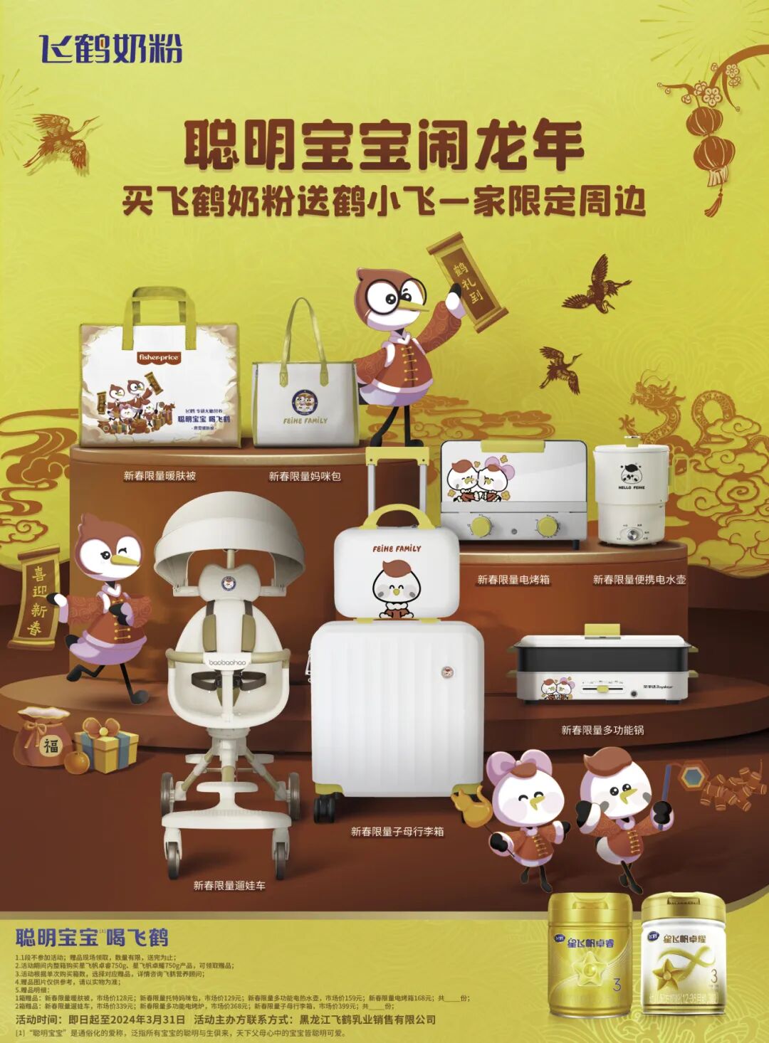 1、活动期间,线下门店购买星飞帆卓睿750g/星飞帆卓耀750g产品,即可领取鹤小飞一家龙年限定赠品!