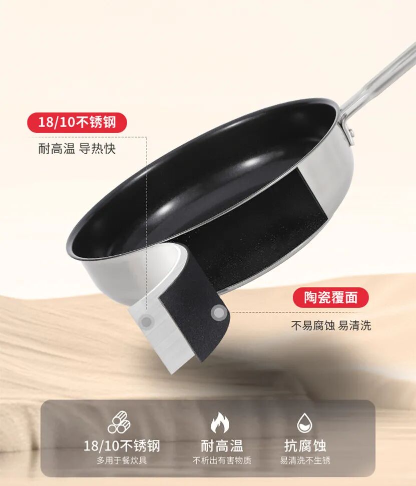 锅身采用18/10不锈钢基材,搭配食品级陶瓷覆面,具有耐高温、导热快、不易腐蚀等特点。真正的0氟材质,让烹饪更健康,从源头杜绝化学涂层隐患,轻松应对中式爆炒。