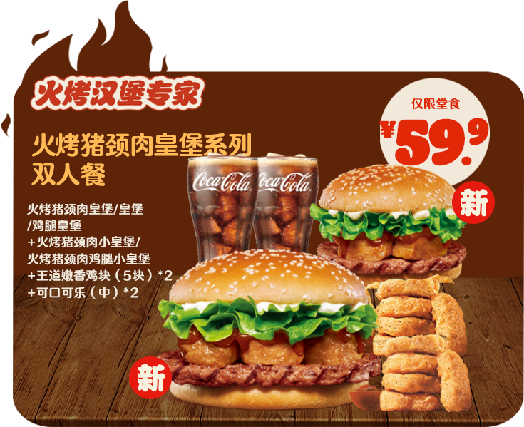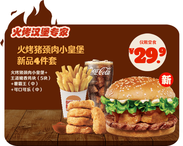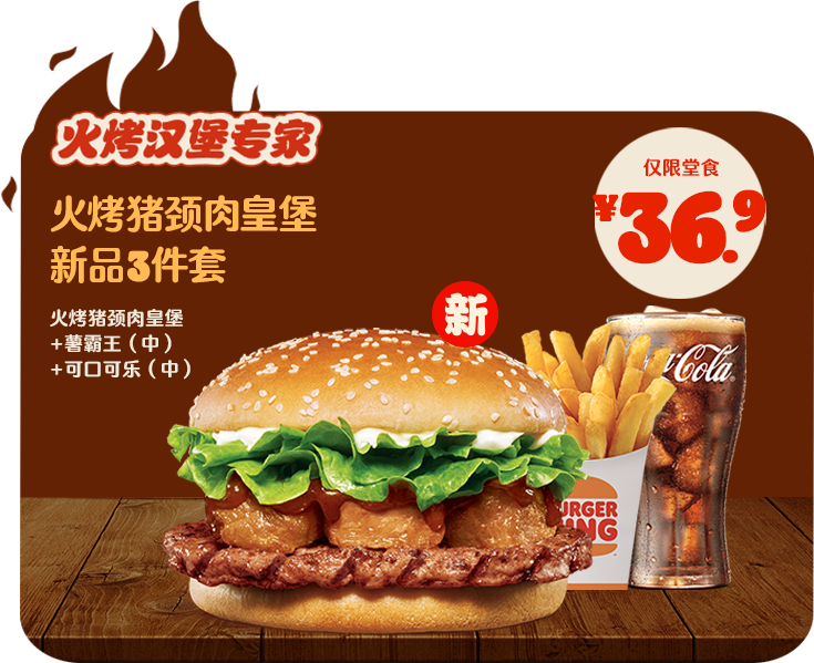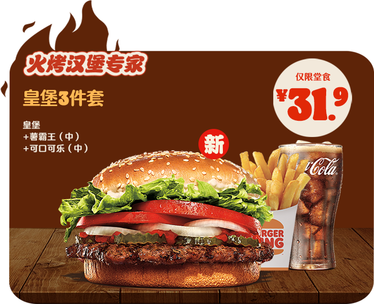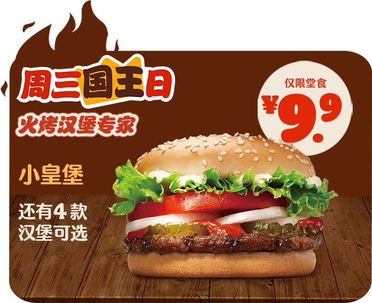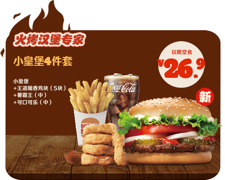 *非外卖渠道价格解释:图示如有划线价格,并非指原价,而是指不参加优惠活动情况下该产品在汉堡王指定门店销售的常规价格(或者指其中所含单品的常规单买价总和)或汉堡王门店建议零售价。除非图示另有解释,否则图示如有节省的金额或折扣比例,是与不参加优惠活动情况下在汉堡王指定门店单独购买该产品的常规价格(或者其中所含单品的常规单买价总和)或汉堡王门店建议零售价相比较。若需要查询当前门店销售的常规价格,可查看相应门店菜单或详询店员。