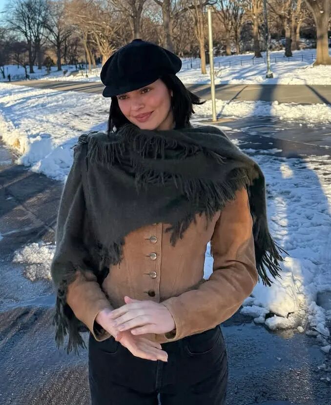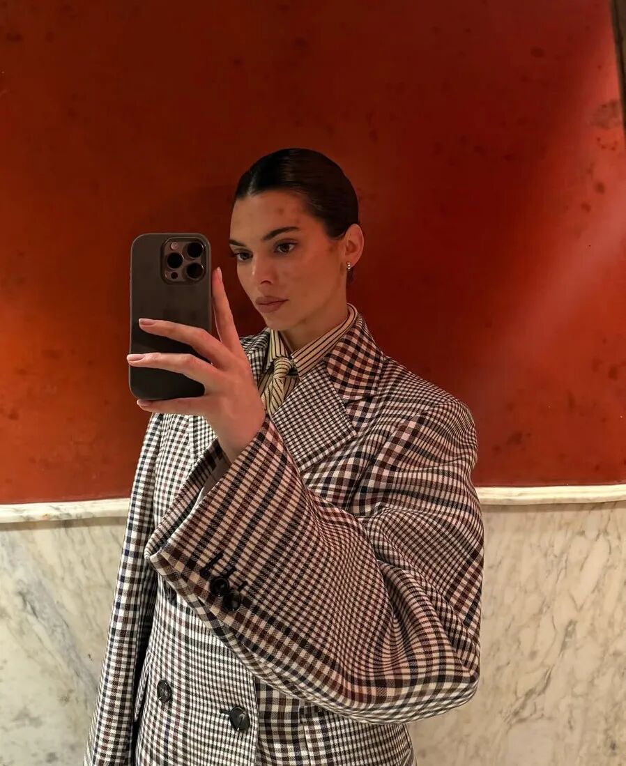 Kendall Jenner的Boxyfit美学则更多了New Money的精致。经典不过时的格纹与挺阔的宽肩剪裁撑出超模独有的气场。材质搭配上她也颇有自己的心得,皮质短款夹克略显沉闷,就用一块披肩平衡出休闲感,增添了平和与温柔。