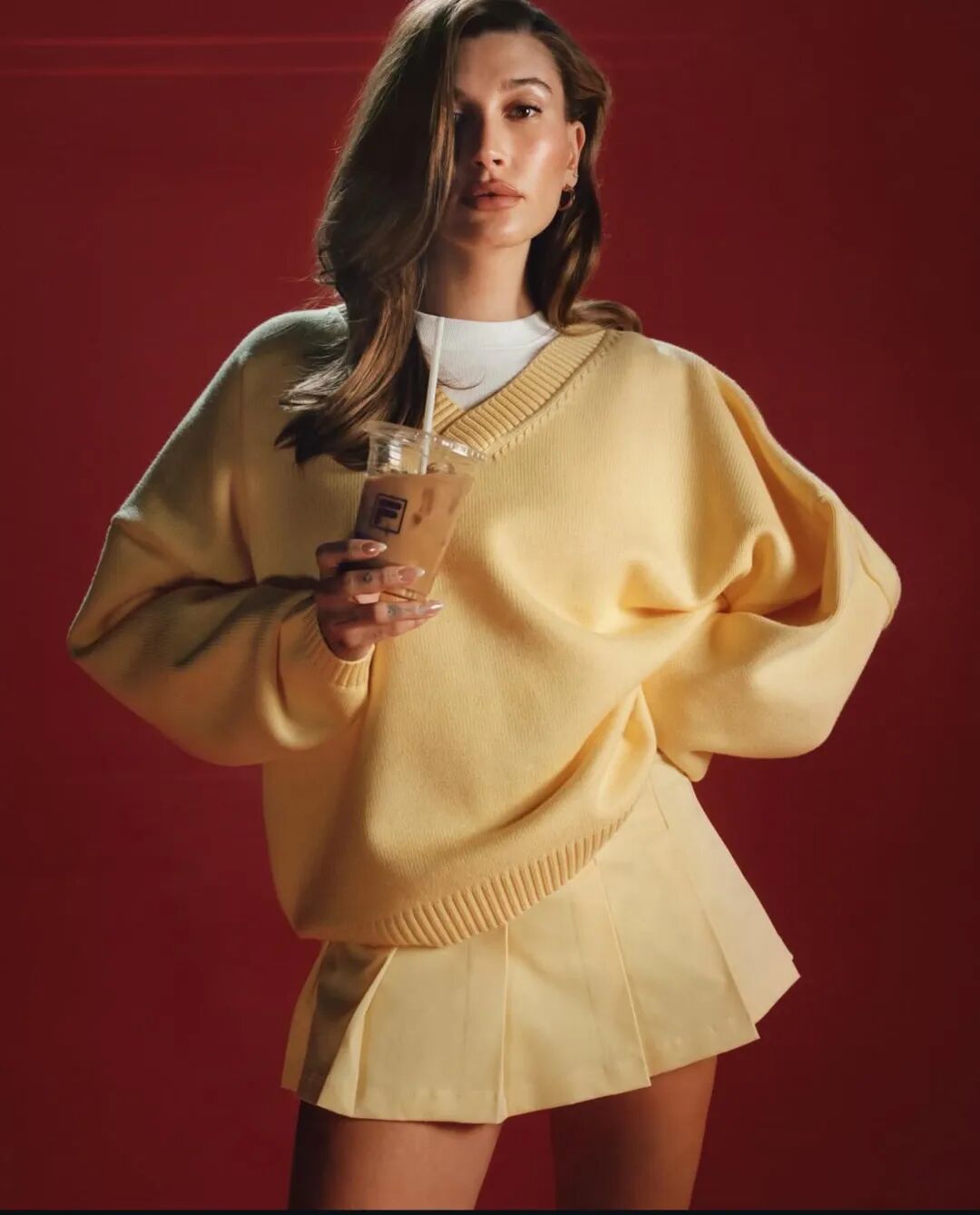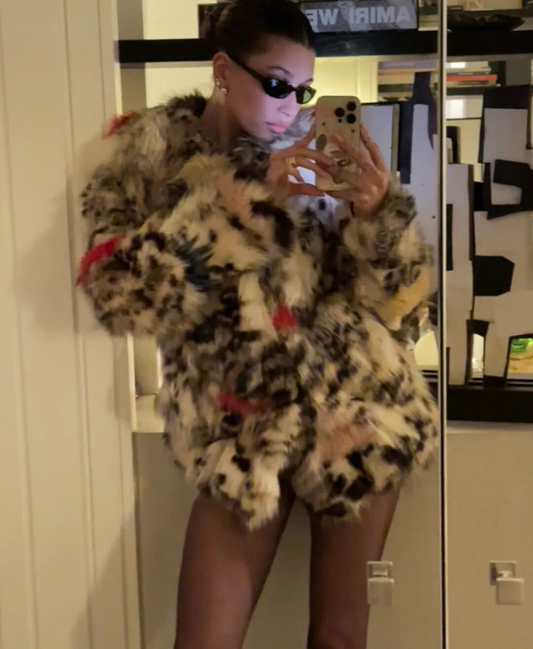Boxyfit并不意味着要完全朝着中性风格靠拢。Hailey用波点丝袜中和了皮衣的冷酷,尖头高跟将线条感一路延展到脚尖。