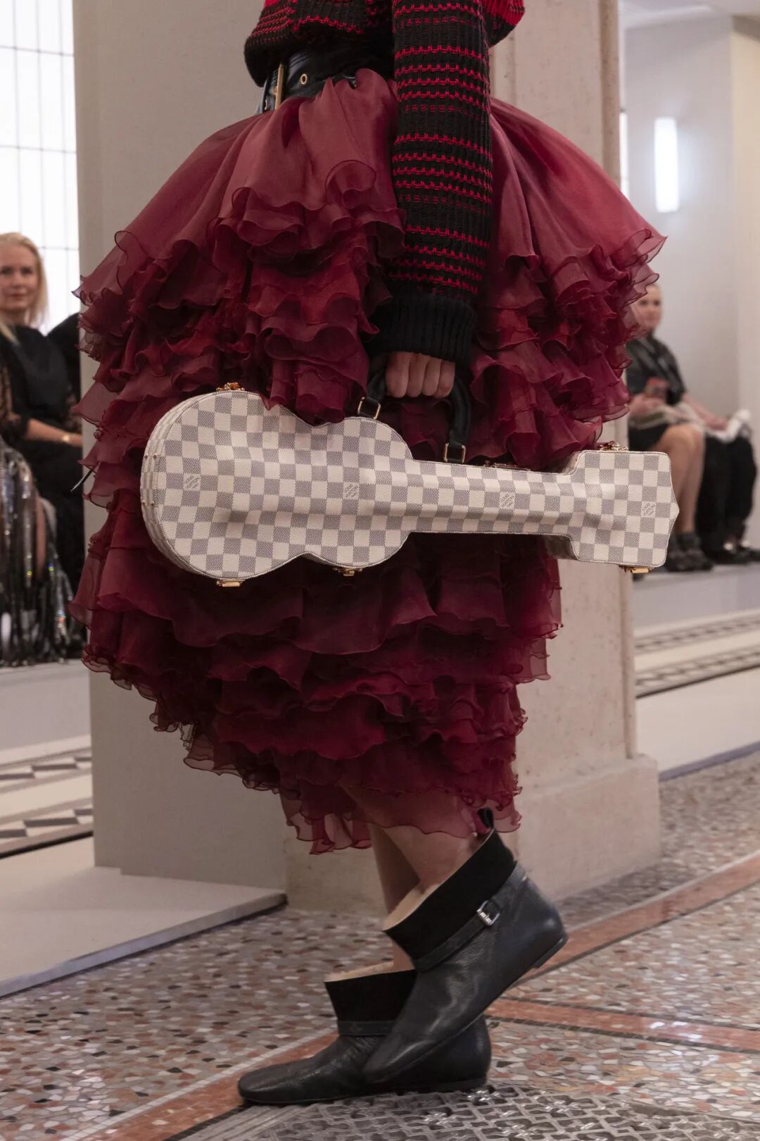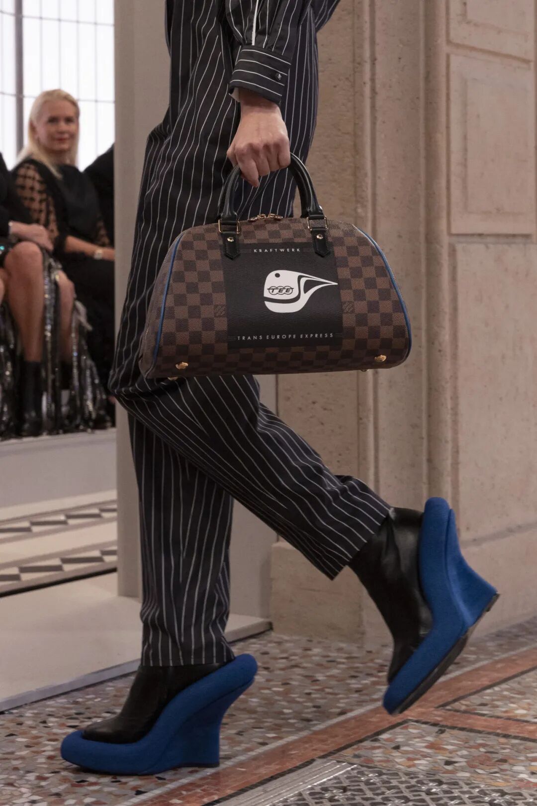另一处Nicolas Ghesquière蓄意为之的伏笔藏在秀场音乐中。德国传奇电子乐队Kraftwerk的合成器旋律再现站台广播,此时播放的正是他们于1977年问世的经典专辑《Trans-Europe Express》。