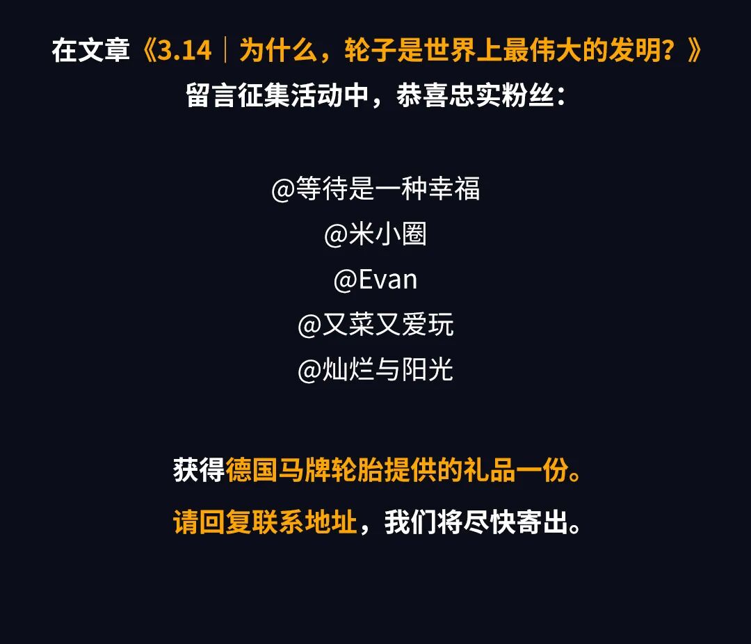 截止时间之前在当期文章留言区留言的Continental德国马牌轮胎微信公众账号关注者,留言足够真情实感,并且同时满足上述抽奖规则。