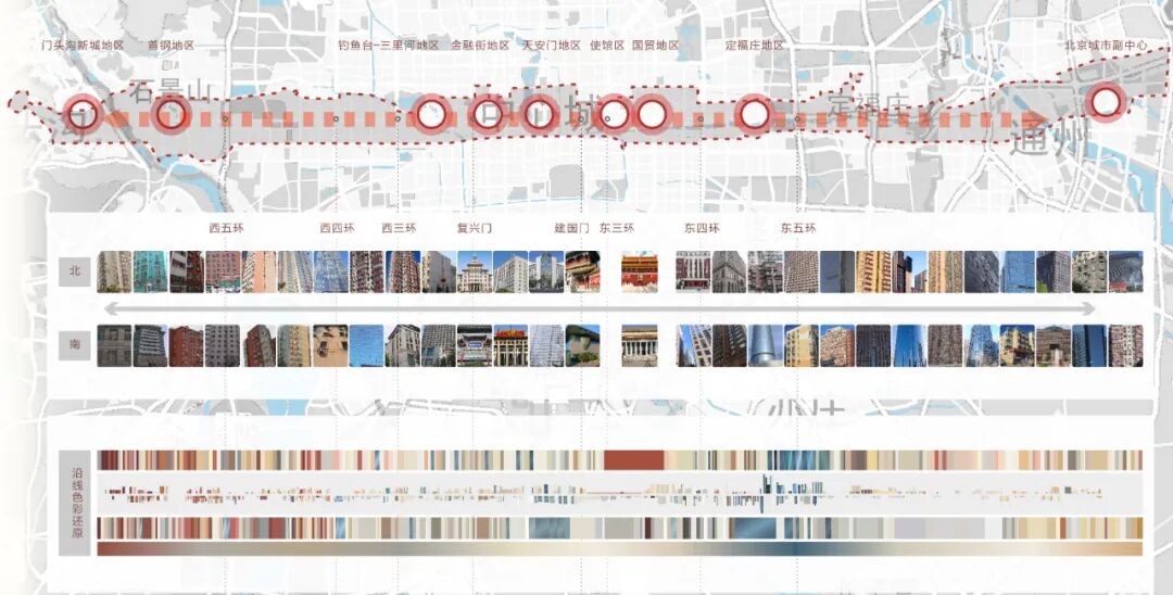 我们选择了9个地点串联起长安街,分别是:门头沟新城地区、首钢地区、钓鱼台-三里河地区、金融街地区、天安门地区、使馆区、国贸地区、定福庄地区、北京城市副中心,以此还原沿线色彩现况。
