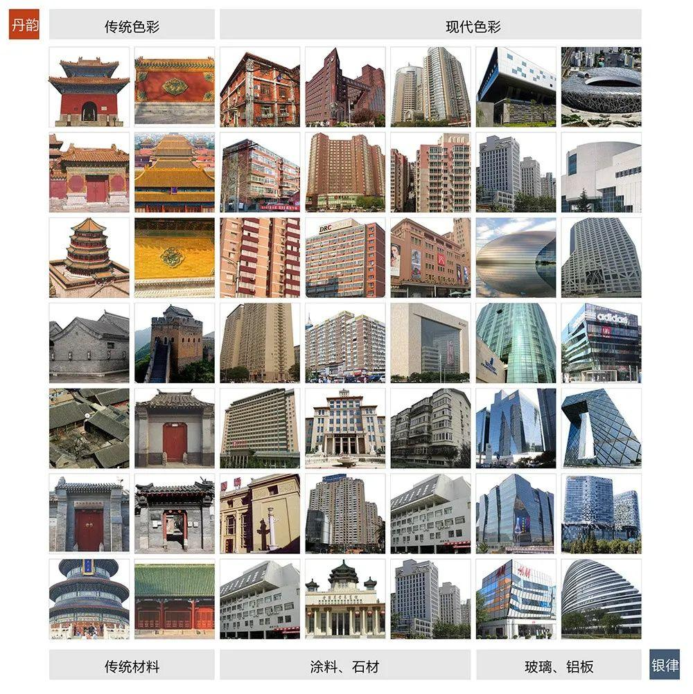 根据北京城市建筑色彩现况提取大量色谱,结合城市及建筑色彩最近百年历史变迁作谱系化分析与梳理,得出北京城市色彩基调为“丹韵银律”的结构。这是两组相互对比又相辅相成的城市风貌色彩。