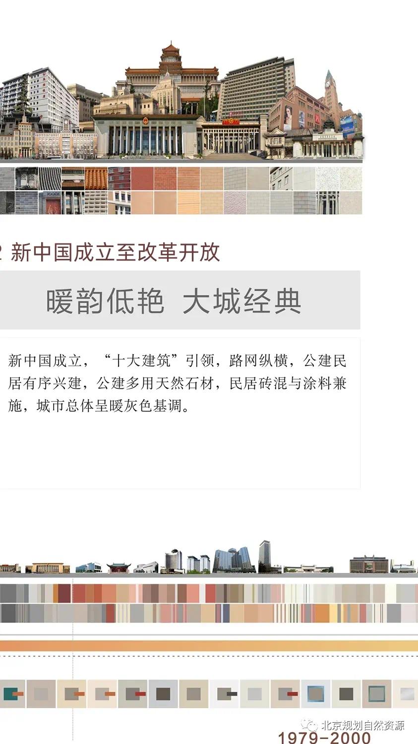 新中国首都城市色彩风貌(1949-1979)以砖瓦石材的本色为主,颜色接近自然建材。解放后,北京城市历经数次的规划与建设的高潮,在“十大建筑”引领下,古城北京旧貌变新颜。
