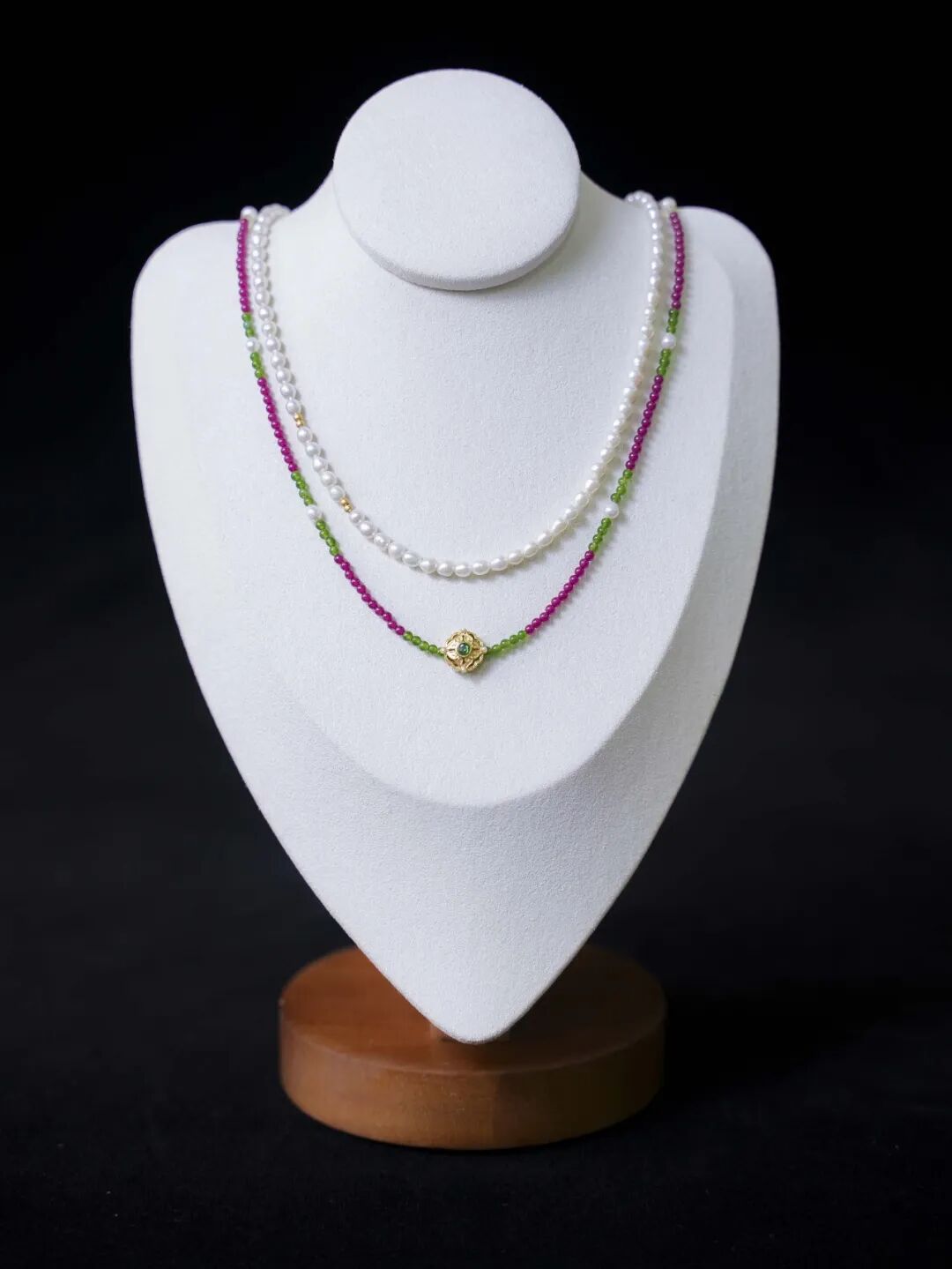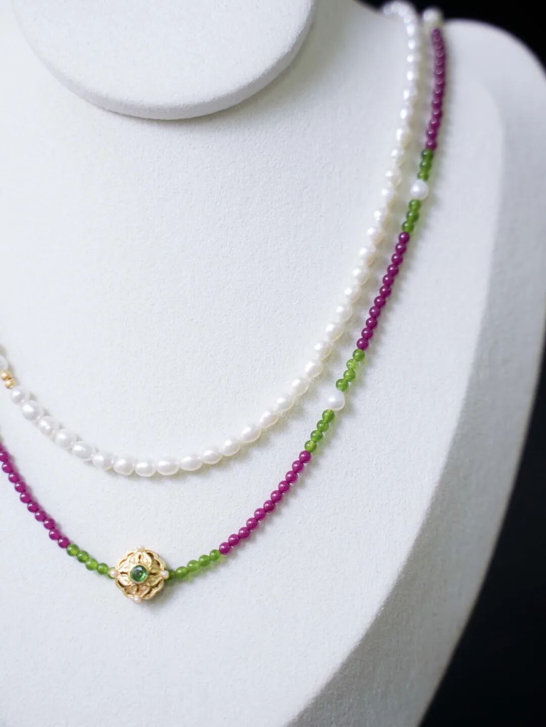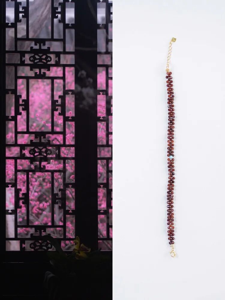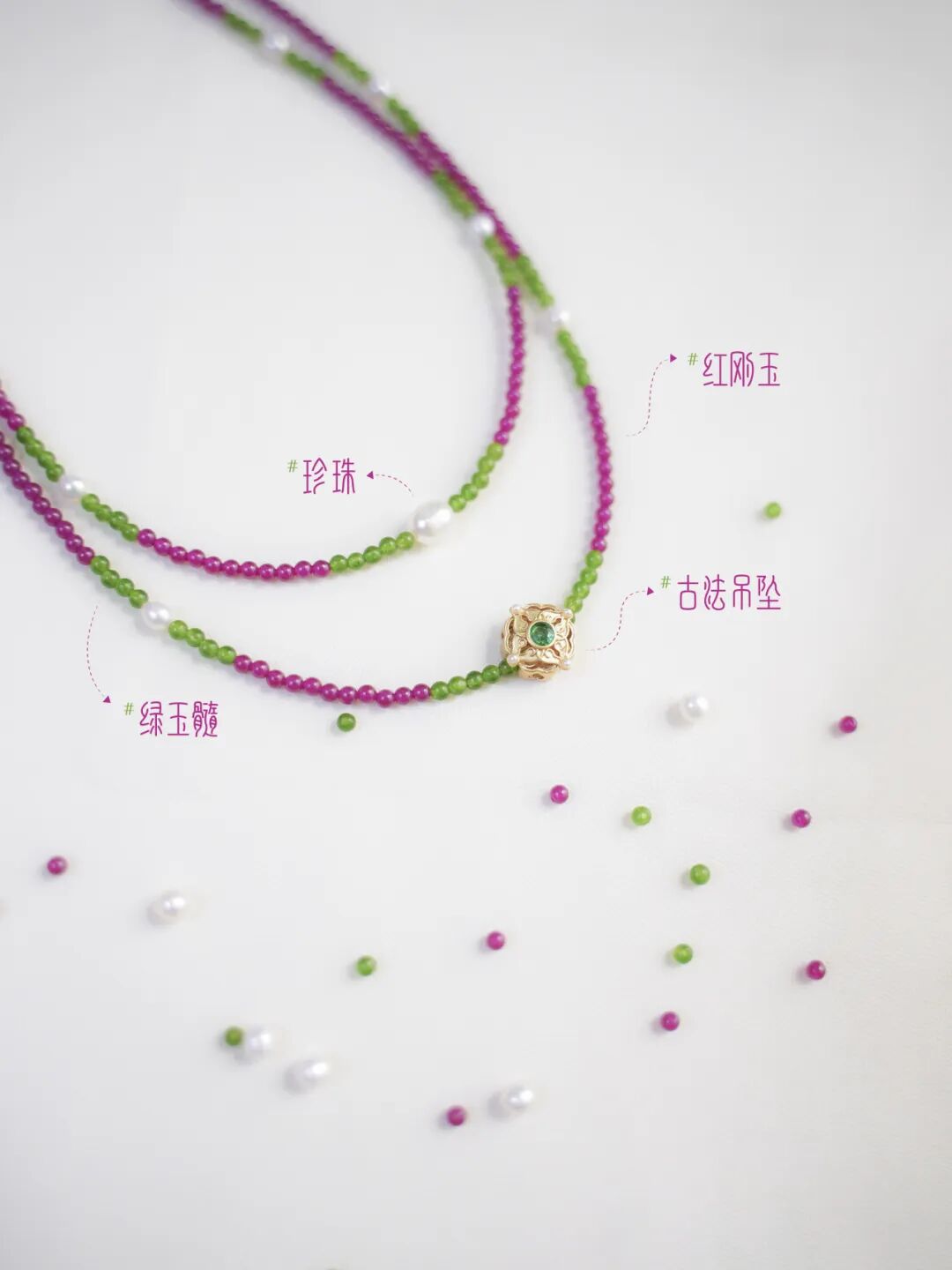 红刚玉的热情和力量与和田碧玉、小米珠完美融合,一种品味不俗之美定格在此时此刻,艳而不俗,淡而有味。