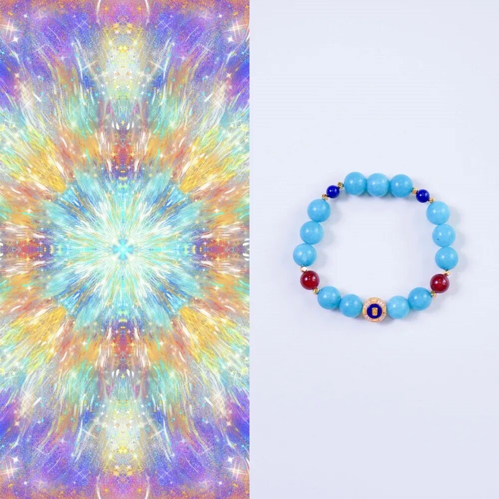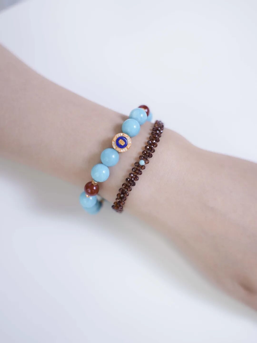 古典永不过时,品牌同名原创手串——佳运,主打复古敦煌色系,且雅且美且好运。蓝色天河石宛如碧蓝的星空,点缀红玛瑙、青金石,举手投足见尽是东方女人特有的风雅韵味。