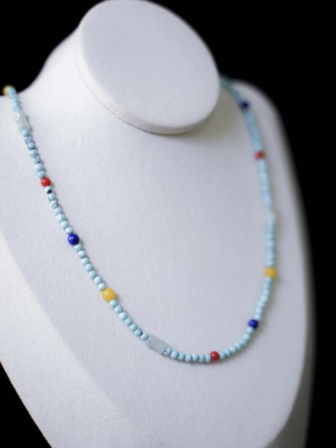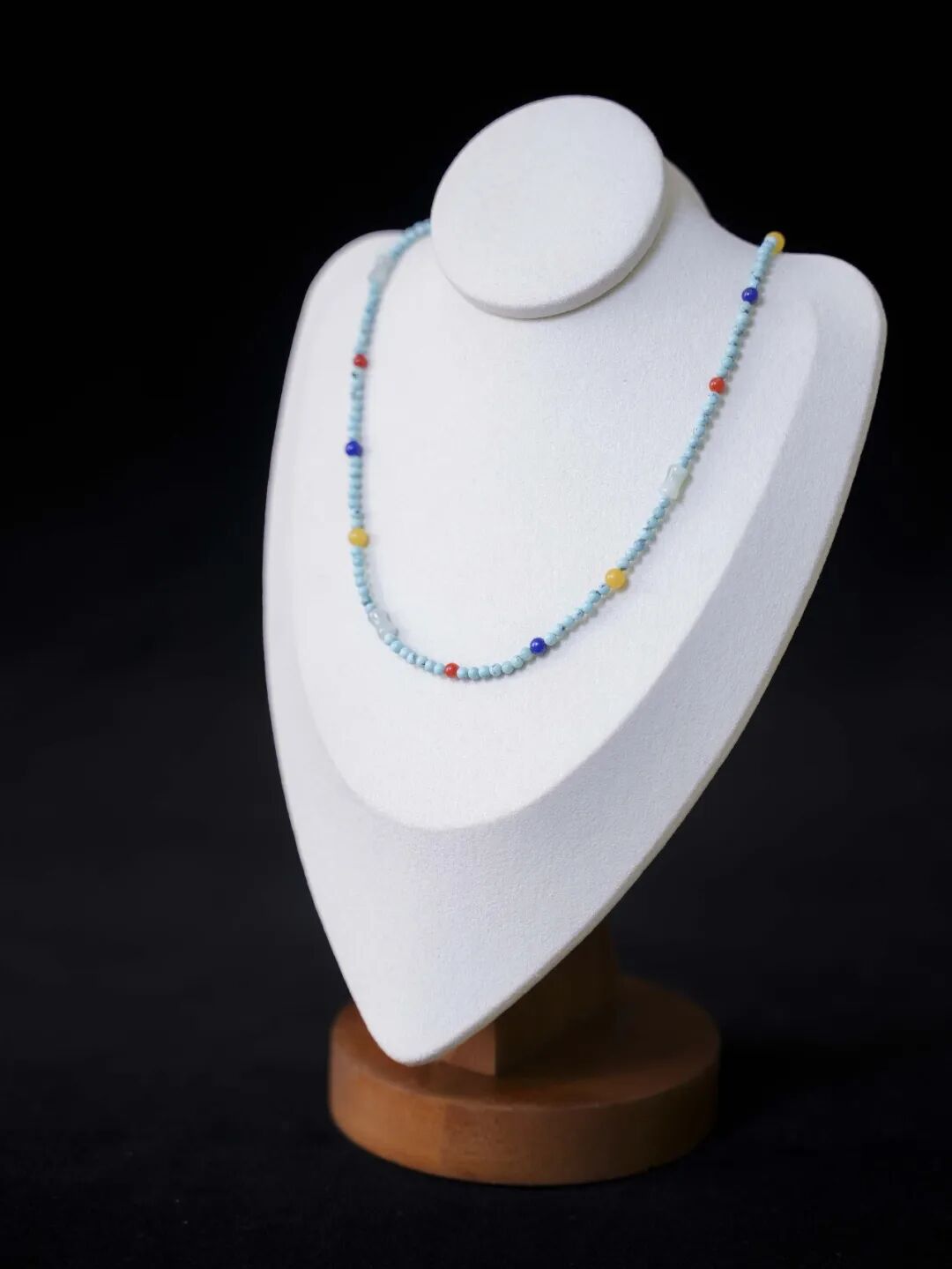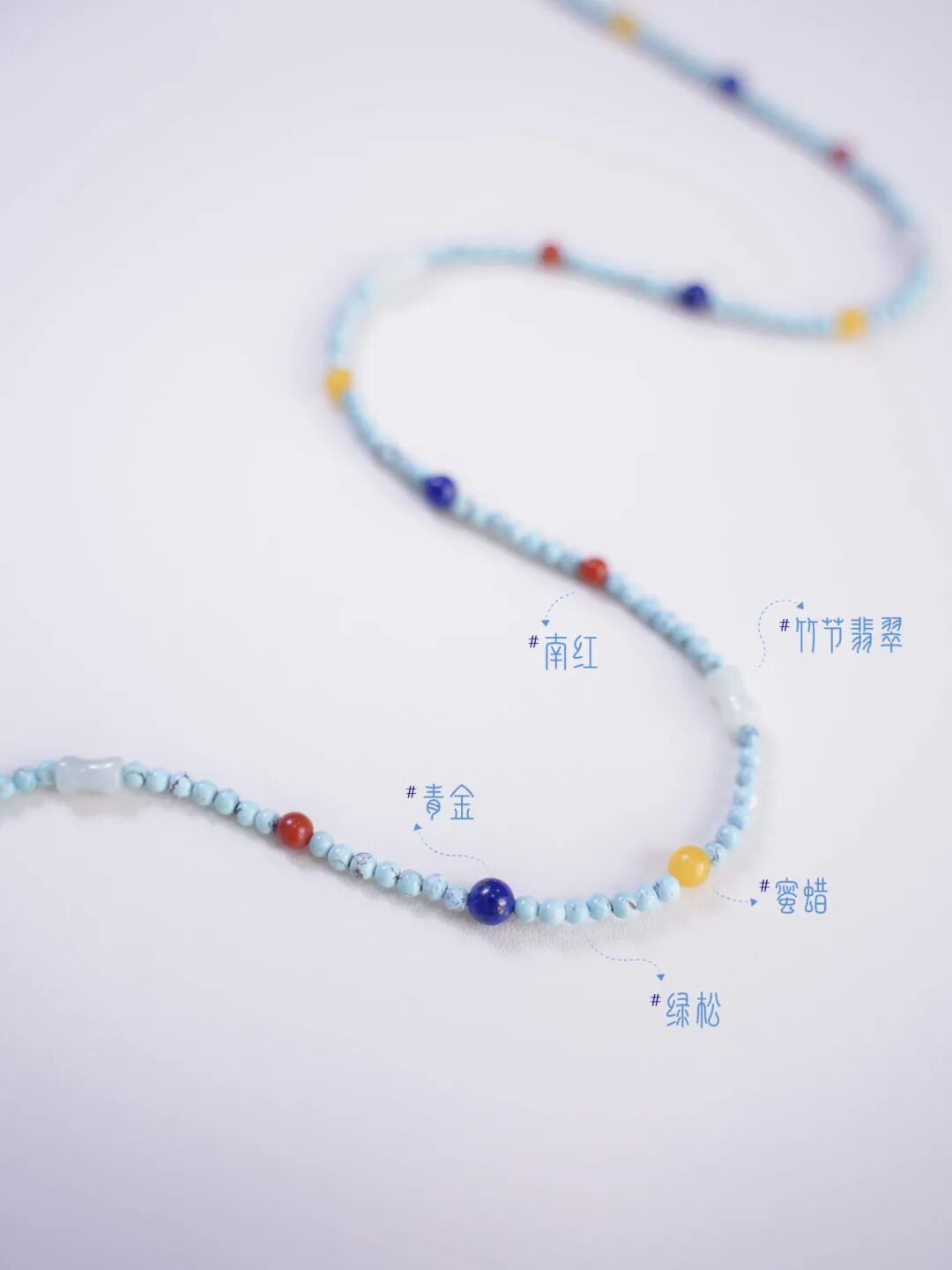 项链款采用3mm的原矿绿松,柔和的光泽散发出神秘纯净的蓝色调。绿松石自古被称为“幸运石”,有着幸福、吉祥的象征。