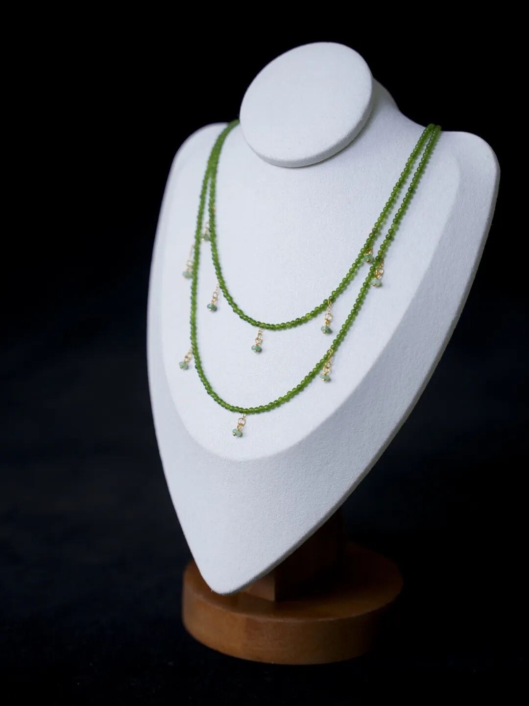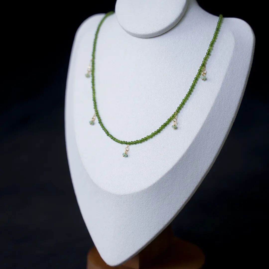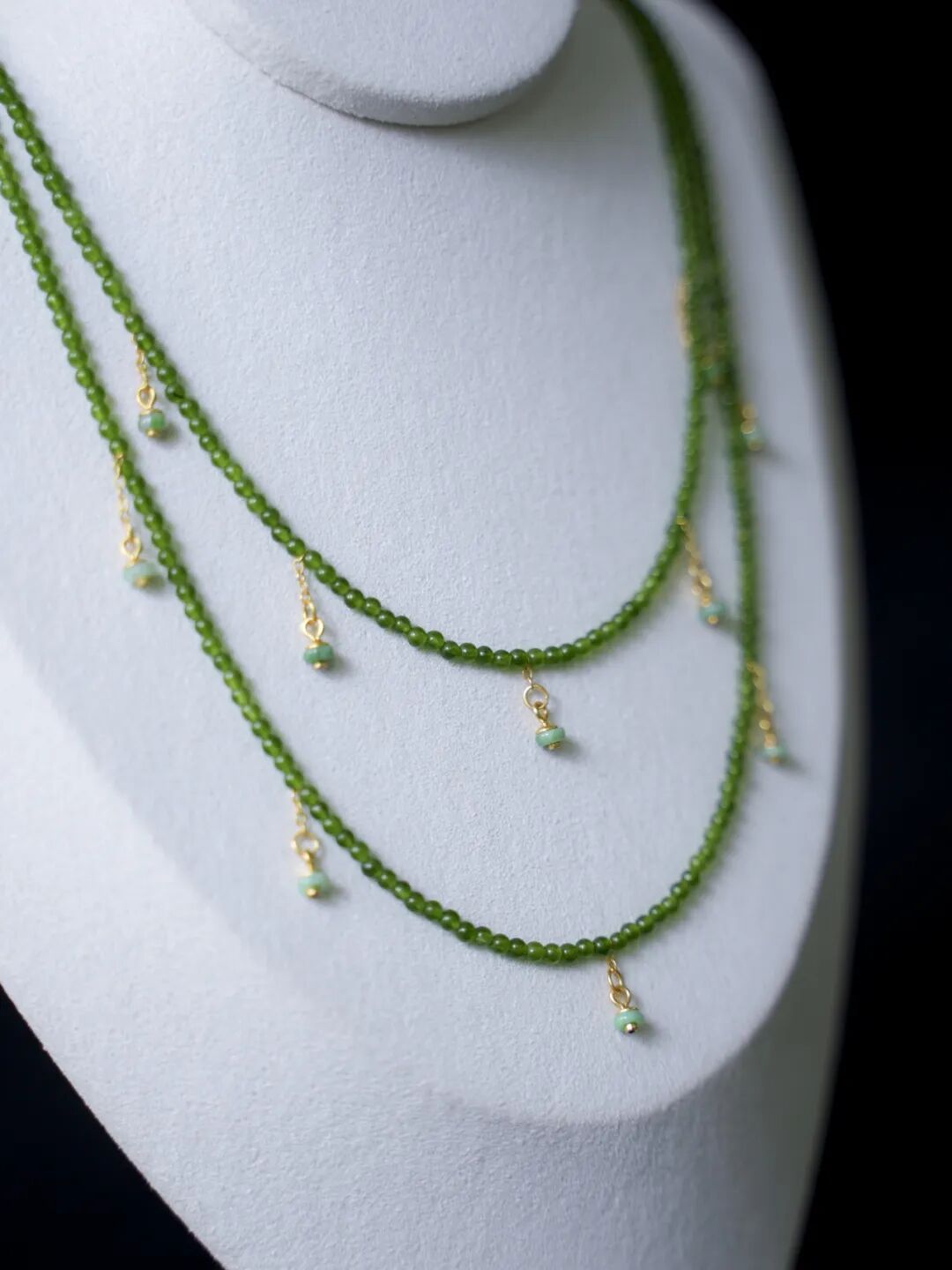 项链款采用3mm的原矿绿松,柔和的光泽散发出神秘纯净的蓝色调。绿松石自古被称为“幸运石”,有着幸福、吉祥的象征。