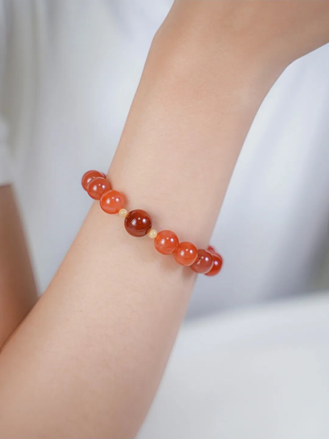 戴在手腕上,衬着白皙的皮肤非常吸睛,纯净温柔的模样,自带岁月静好之美。同时,南红也自带红红火火顺顺利利的美好寓意。