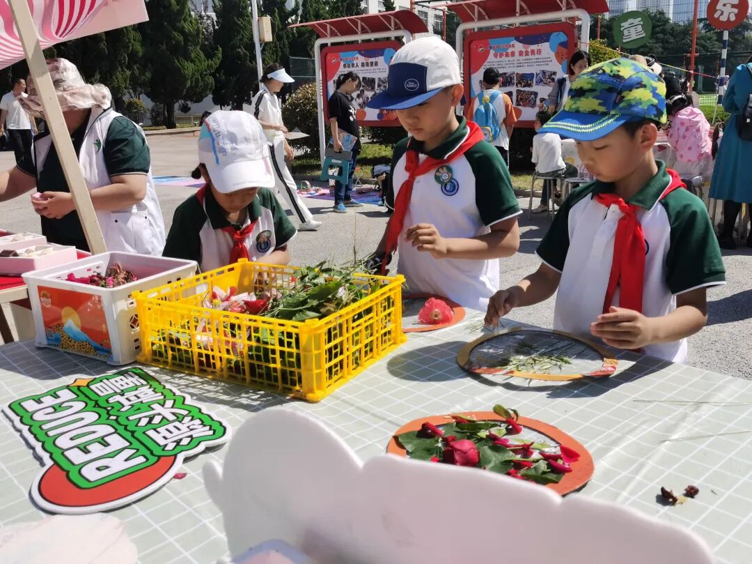 绿色环保创意市集上,志愿者将联合国废弃物管理的3R原则和精心制作的环保酵素、堆肥黑金土、环保手工皂等学校特色零废弃环保手作展示给大家,又在现场利用落花、落叶、枝条、小草等自然凋落物创作“零废星球”自然画,生生不息的自然物循环,吸引了不少小伙伴参与。