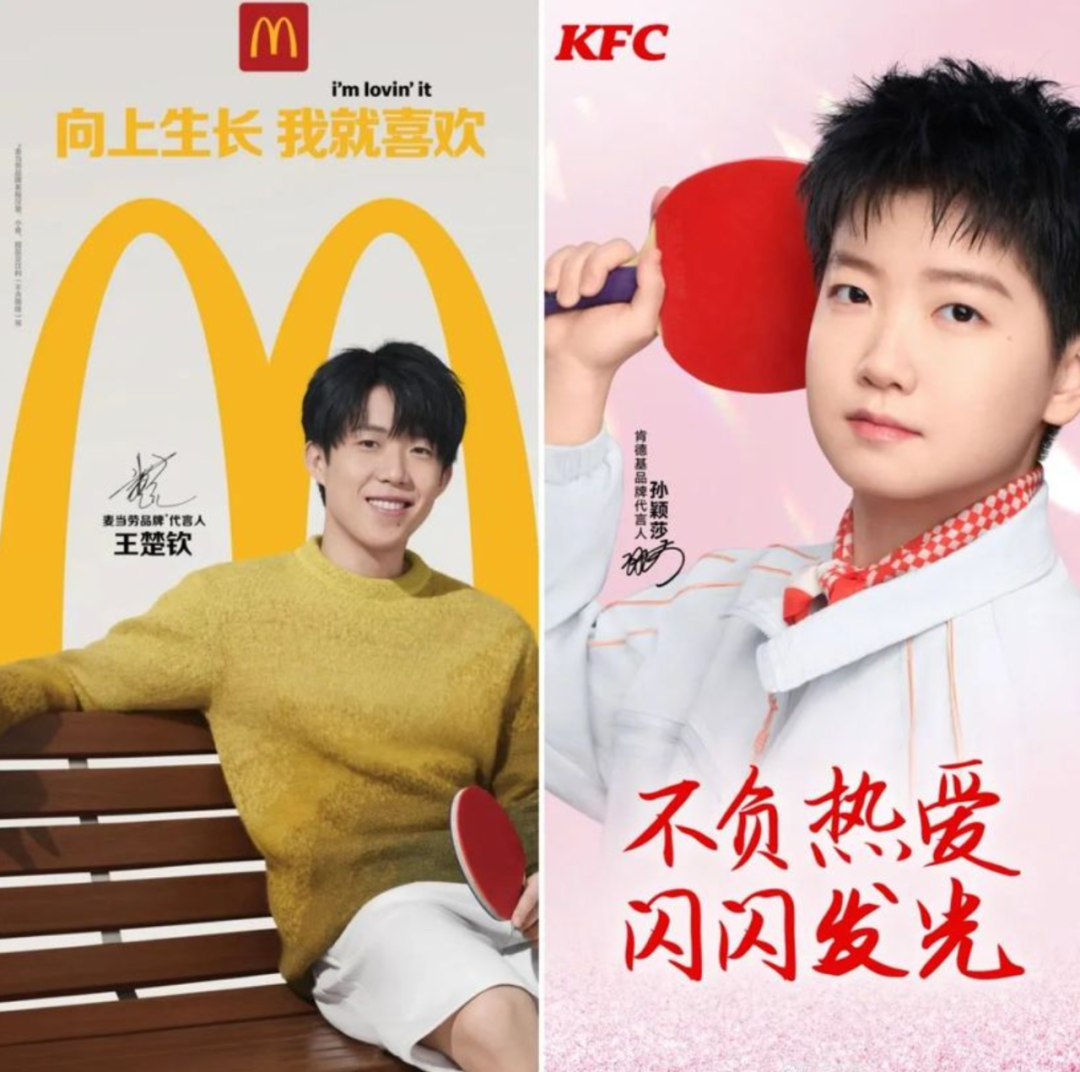 麦当劳签下王楚钦、肯德基早一步拿下孙颖莎,国乒双子星分别入驻金拱门与K记,“麦肯大战”直接从C位炸鸡打到了C位代言。