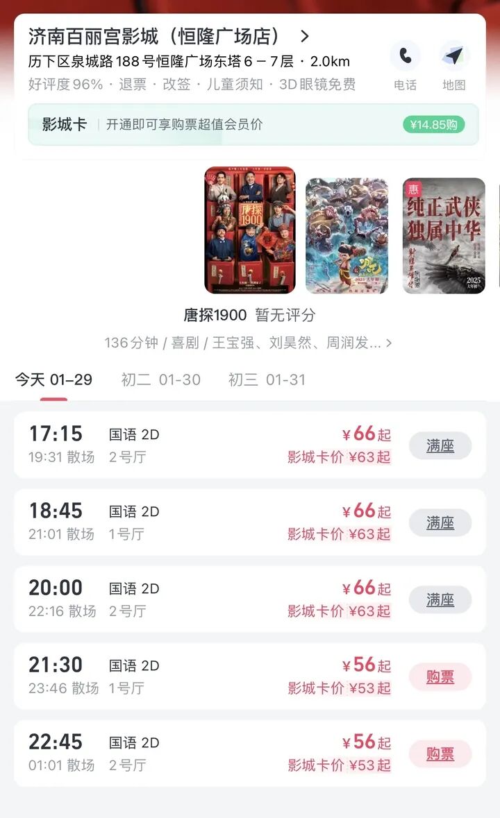 在纬十二路一家商场内,与新春有关的元素十分丰富,处处洋溢着喜庆的氛围,年味儿十足。商场内各门店人气高涨,各品牌推出满减、折扣特惠、春季款上市等活动,前来购物的市民络绎不绝。今天上午10点,新黄河记者来到山东文旅星辉影城和谐广场店,尽管商场刚开门不久,新黄河记者发现《唐探1900》《封神第二部》《哪吒2》等影片的早场都是满员。售票处更是排起了长龙,工作人员在几台售票机前忙得不可开交。有观众告诉新黄河记者,光是排队购票就花了将近半小时,可见今年春节档的火爆程度。不仅是星辉文旅影城如此,其他电影院也是人山人海——新黄河记者在玉函银座发现,购物区客流稀少,但一走进新世纪影城,便感觉影城大厅热闹非凡、人头攒动。几乎每个影厅都座无虚席,洗手间也在排队。不少观众晒出了影票,纷纷表示“今年春节档的电影太火了,不提前买票根本抢不到”“如果没有提前在线上平台预定,到了现场有钱也买不到票了”。此外,恒隆广场百丽宫影城的等待区坐满了等待入场的观众,无法再多坐下一人。时间刚刚过16:00,百丽宫影城今日的17:15场、18:45场、20:00场的《唐探1900》和19:30场的《哪吒之魔童闹海》均已满场——如果您是“空降”的影迷,只能买到几个小时以后的场次了。新黄河记者在淘票票平台搜索发现,今天济南各个影院多个影片的热门场次票价在29.9元到70元不等,大多数影城的票价都在50元到60元。(点击查看详细报道)点击图片查看更多报道
