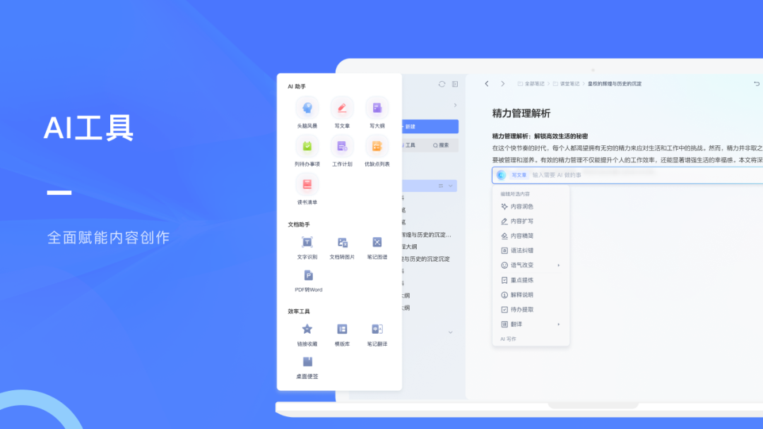 它拥有简洁直观的界面,让记录变得轻松自然。课堂上,你能快速记录老师讲解的重点知识,支持文字、语音等多种记录形式,不错过任何关键内容。课后,收集学习资料也十分方便,无论是网页文章、图片还是文档,都能一键保存到笔记中。在小组作业时,有道云笔记的多人协作功能大显身手,组员们可实时共同编辑文档,交流想法,提高协作效率。AI工具赋能内容创作,写作、脑暴、润色、提炼、翻译等一键搞定,让工作学习效率倍增。
