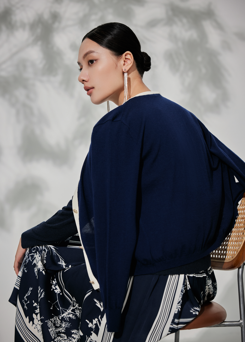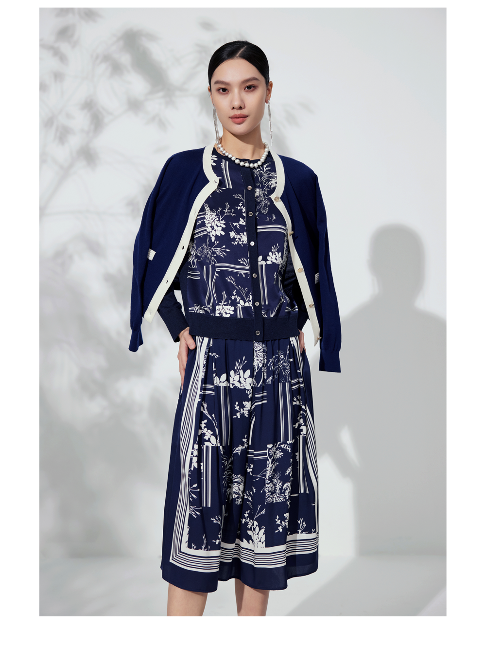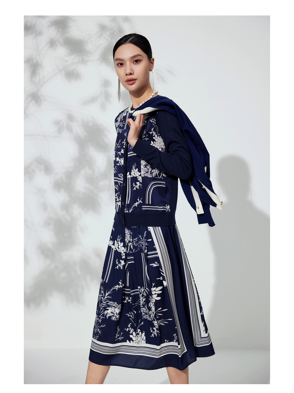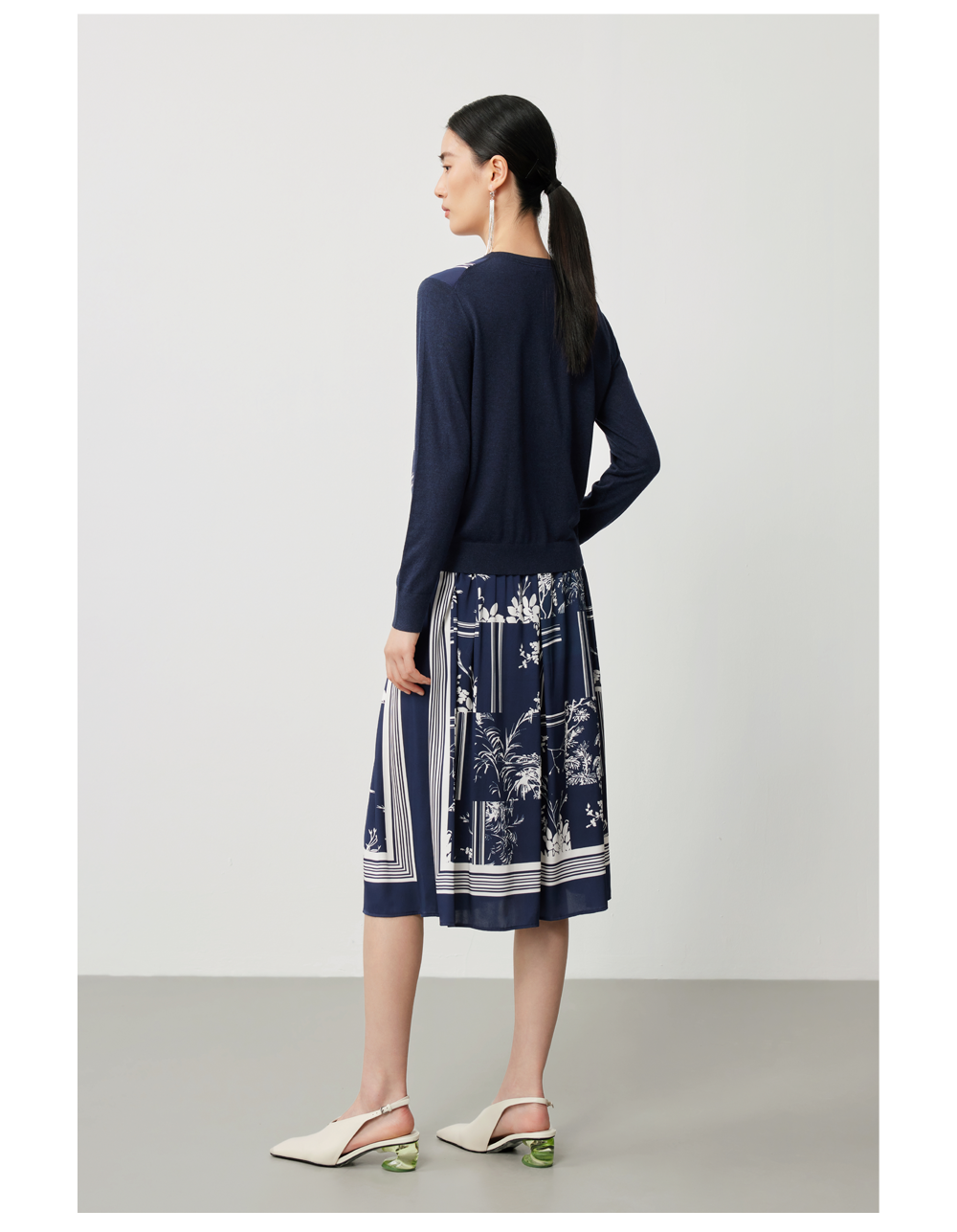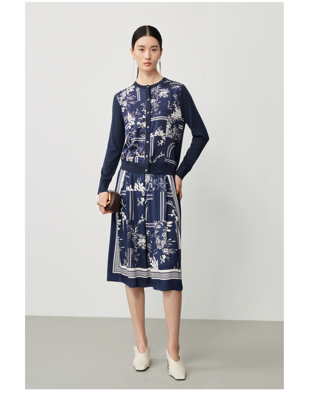 针梭相拼的丝羊绒印花开衫