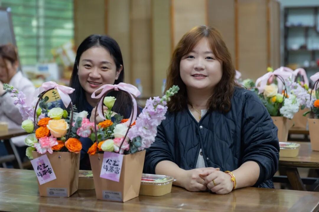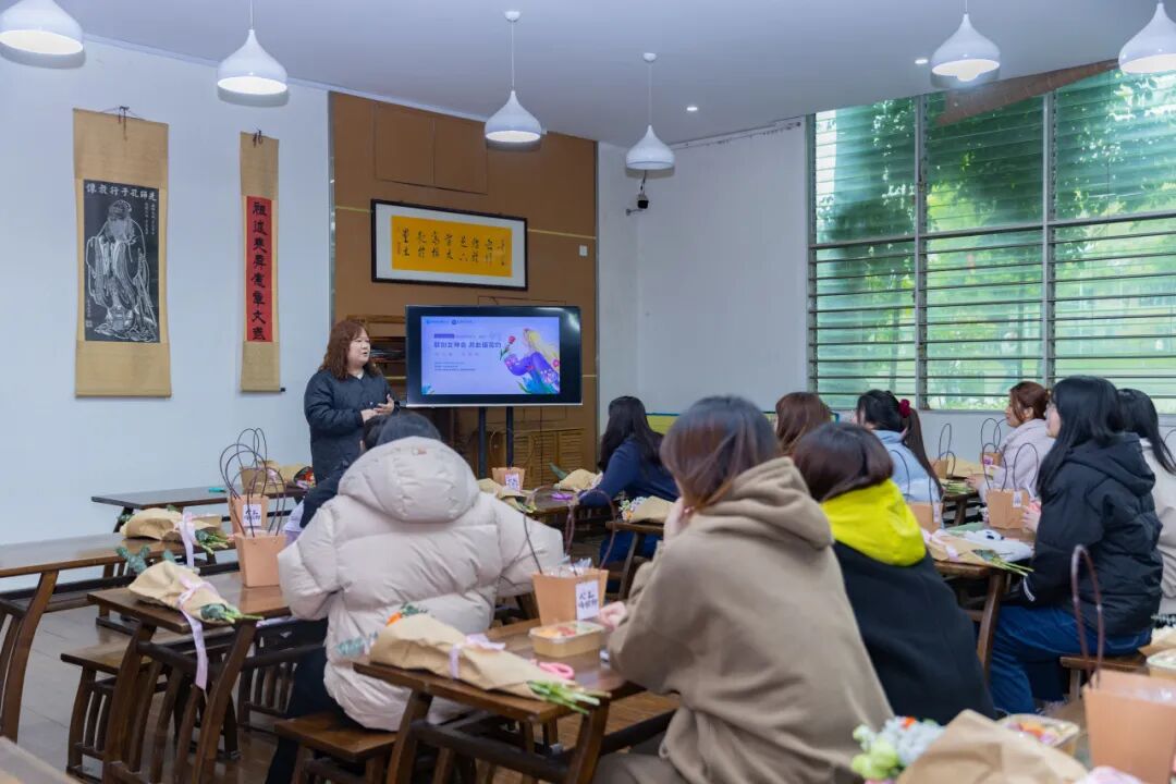 紧接着,专业花艺师为大家详细讲解了花卉寓意、花艺基础知识及插花技巧,从如何挑选新鲜饱满的花材,到运用正确的裁剪方法展现花材的独特姿态,再到巧妙地进行色彩搭配,打造出和谐美观的视觉效果,每一个细节都讲解得深入浅出。