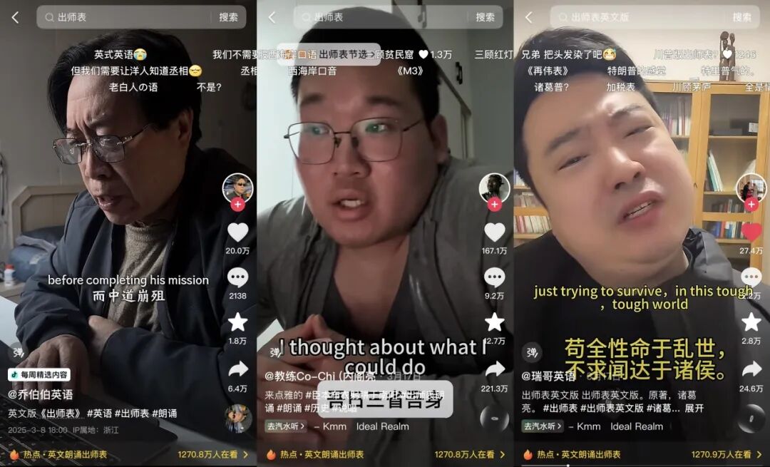 3月8日,抖音创作者@乔伯伯英语首先用伦敦腔英语深情演绎《出师表》,带动了@教练Co-Chi (内阁亮 等一众创作者争相参与,各式风格的双语《出师表》迅速走红。