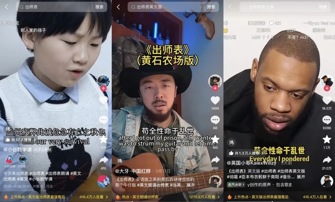 抖音创作者@教练Co-Chi (内阁亮 诙谐演绎“西海岸”风格,@瑞哥英语 展现特色口音英语的魅力,@小谷数学课 用稚嫩的童声英语朗诵经典段落,@大牙·中国红脖 带上牛仔帽融入吉他演奏,生动展现美剧牛仔风格版《出师表》,更有外国创作者@英国小哥KalexWillzy 参与翻译朗诵,分享不同视角下阅读《出师表》的感受。一觉醒来,诸葛亮已“游历四方”,变成了更加国际化的模样,但不变的是,那种悲壮、忠诚与赤子之心依旧震撼人心。