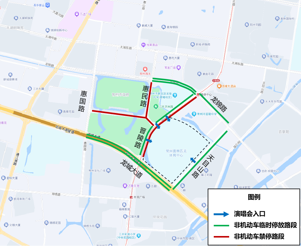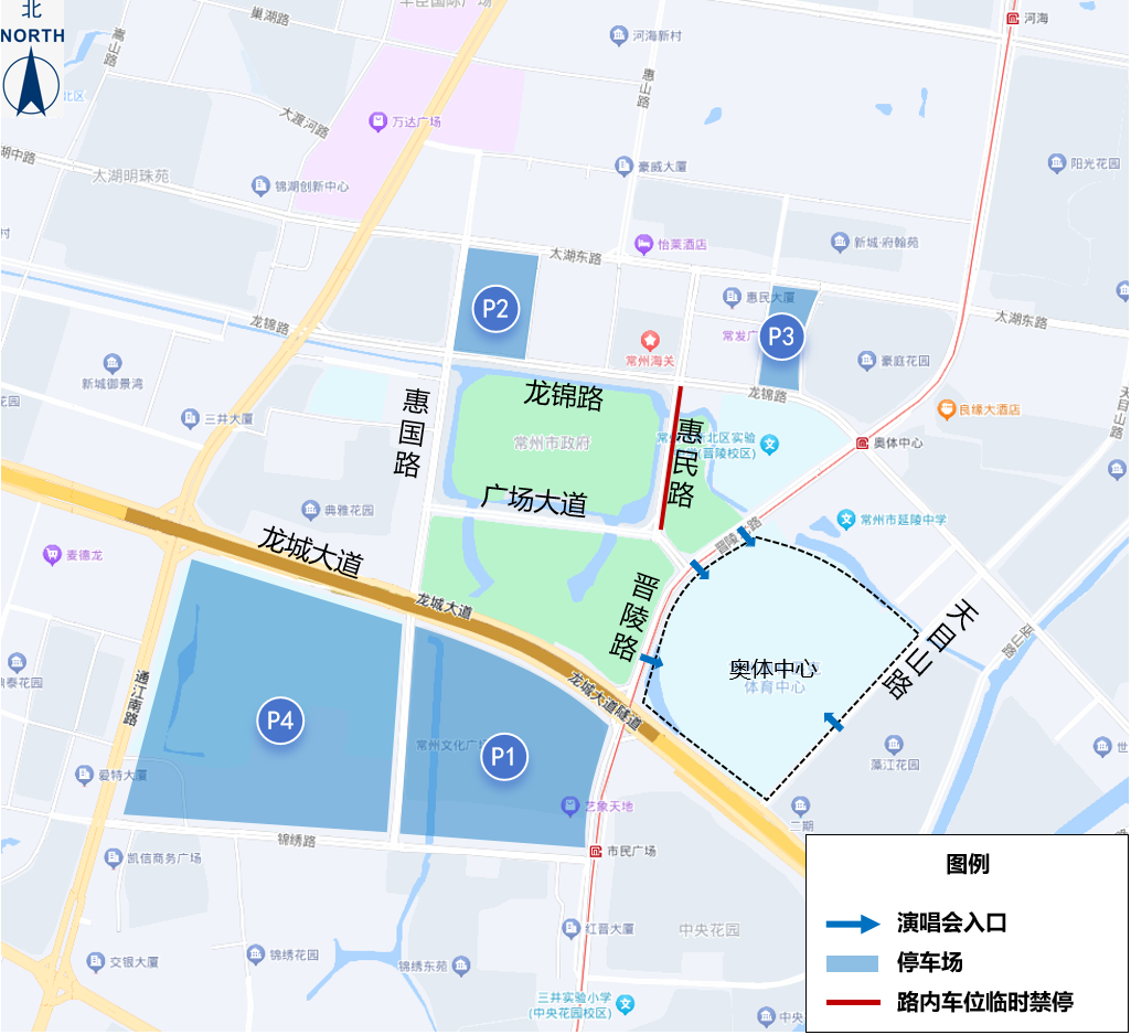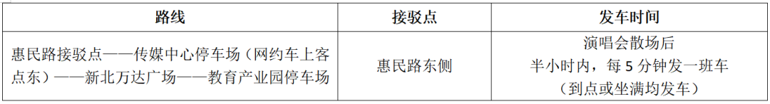 为快速疏散散场人流,歌迷们可乘坐免费接驳大巴,前往龙锦路网约车上车点或传媒中心、新北万达、教育产业园等停车场。