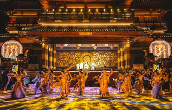 启唐城:位于江海澜湾旅游度假区,为超大型原创沉浸式唐风实景游戏乐园,共划分为平康坊、皇城、东市、西市、永宁坊五大主题区域,25万平方米唐风建筑集群1:1深度还原古风街区,打破了常规大型室内沉浸式剧场的空间壁垒,真实还原的客栈、酒馆、街道、大殿等场景,为游客们带来极致代入感。