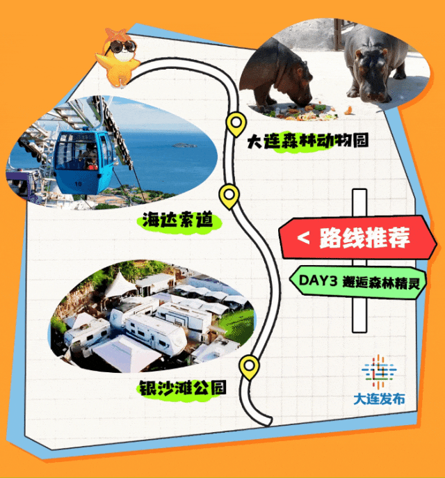 从南门进入动物园,所有区域游览完就到了动物园北门。可以带娃乘坐海达索道,体验在空中俯瞰森林动物园、眺望星海湾大桥。