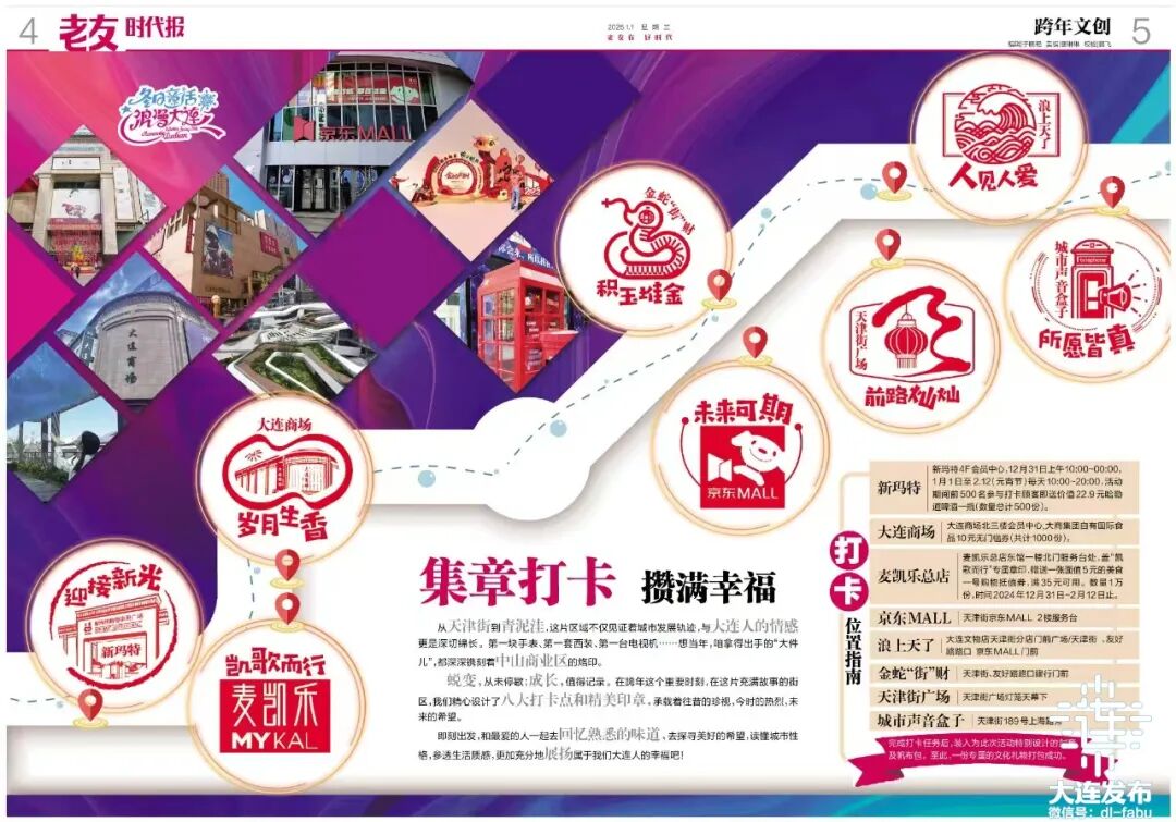 跨年特刊还设有打卡集章版面,市民游客可在大商麦凯乐总店、新玛特、大连商场、天津街京东MALL、佳兆业广场免费领取,并在8个打卡点集齐精美印章:大连新玛特(4楼会员中心)、大商麦凯乐总店(东馆一楼北门服务台)、大连商场(北3楼会员中心)、天津街京东MALL(2楼服务台)、浪上天(大连文物店天津街分店门前广场)、金蛇“街”财(天津街友好路路口建行门前)、天津街广场(天津街广场灯笼天幕下)、城市声音盒子(天津街189号上海路旁)。