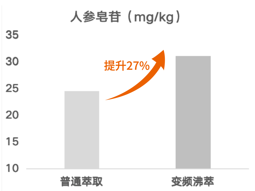 平时我们用开水冲一杯五宝茶,喝了好像也没什么感觉,其实,可能是因为里面的人参皂苷含量太低。而用变频沸萃技术制作的五宝茶,营养物质得到充分释放,经过检测,可以让功能成分人参皂苷提升27%。
