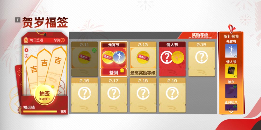 这里小可还要送给车手们一份元宵节礼物,今日登录参与【贺岁福签】签到即可领取元宵节专属动作“寄月相思”以及专属签到奖励,最高可获得额外的免费1抽,还有每日签运等你来解锁!