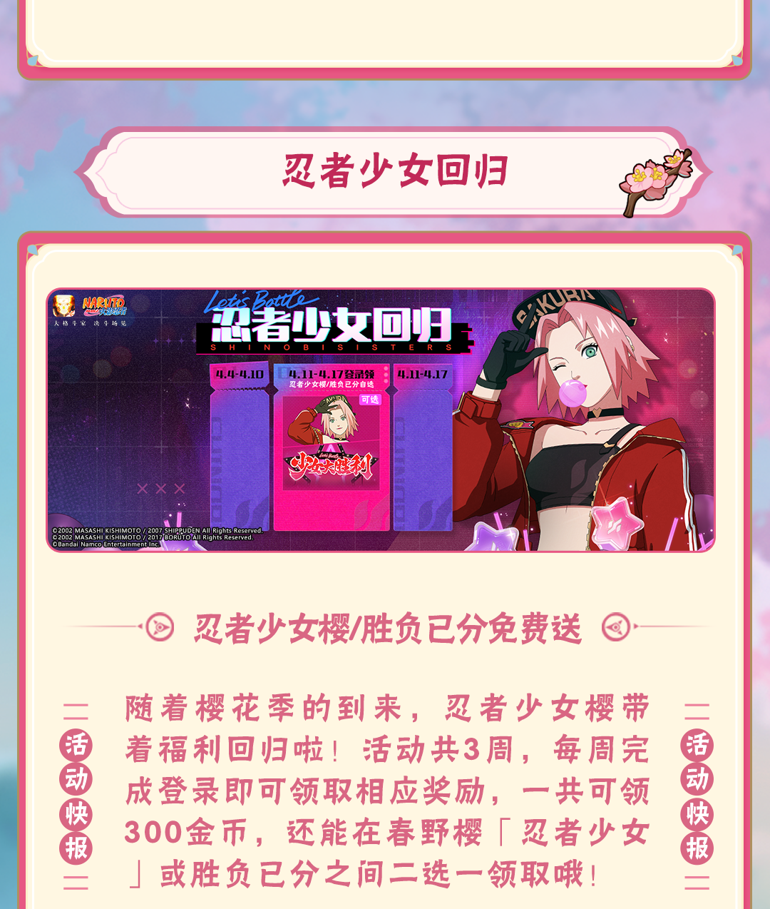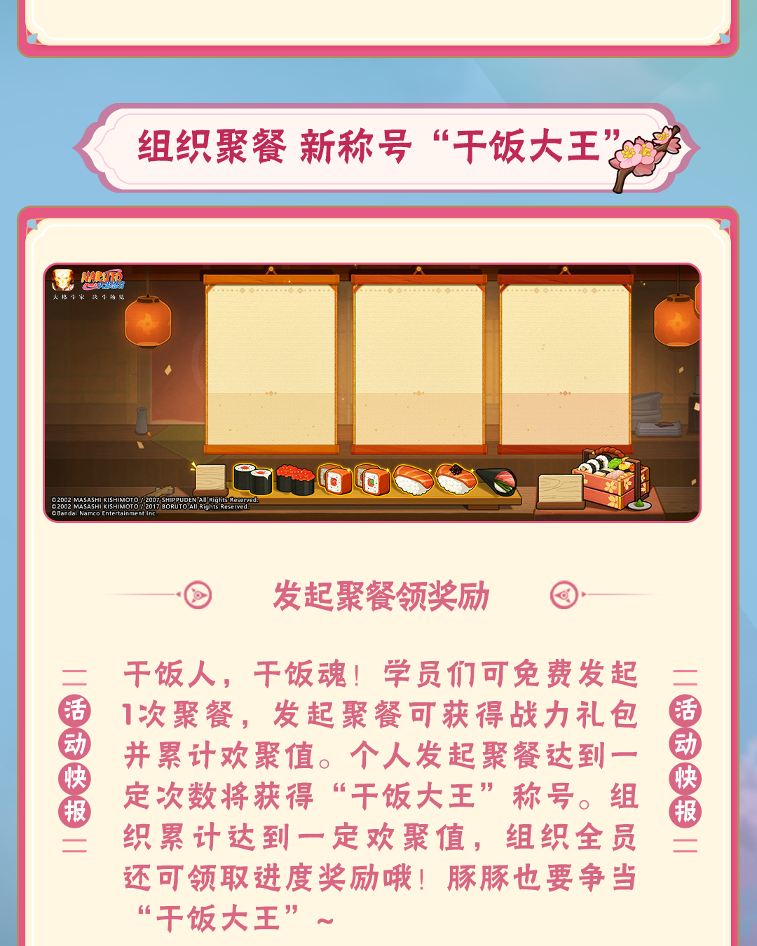 点击公众号菜单栏【豚豚福利】,参与火影忍者手游情报社活动,可领取金币、忍玉、随机忍者碎片等福利!