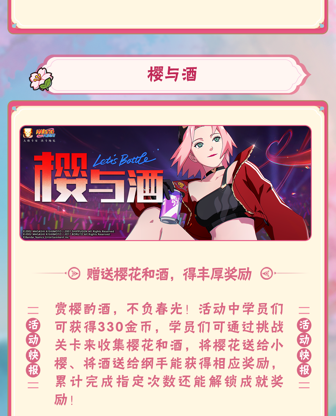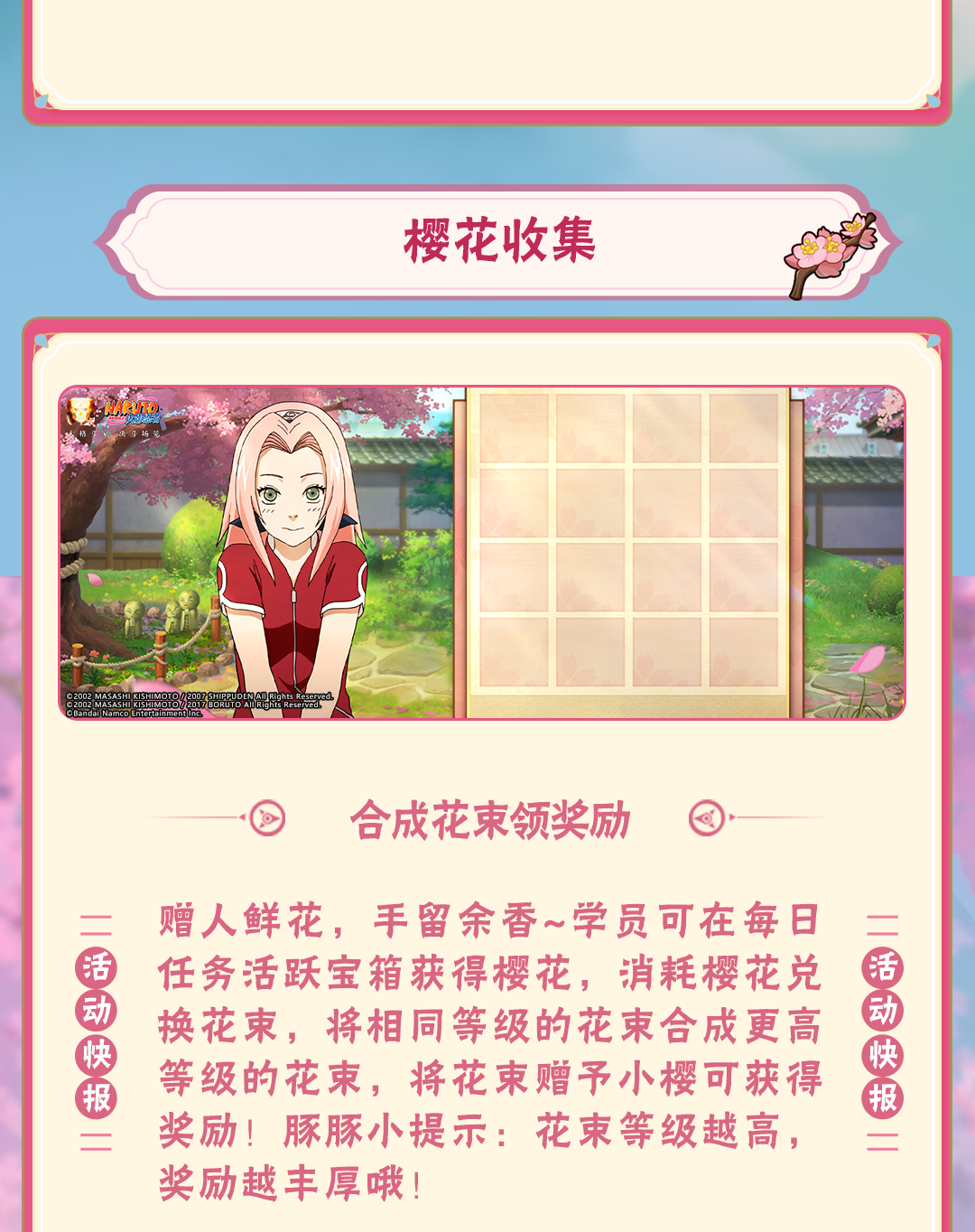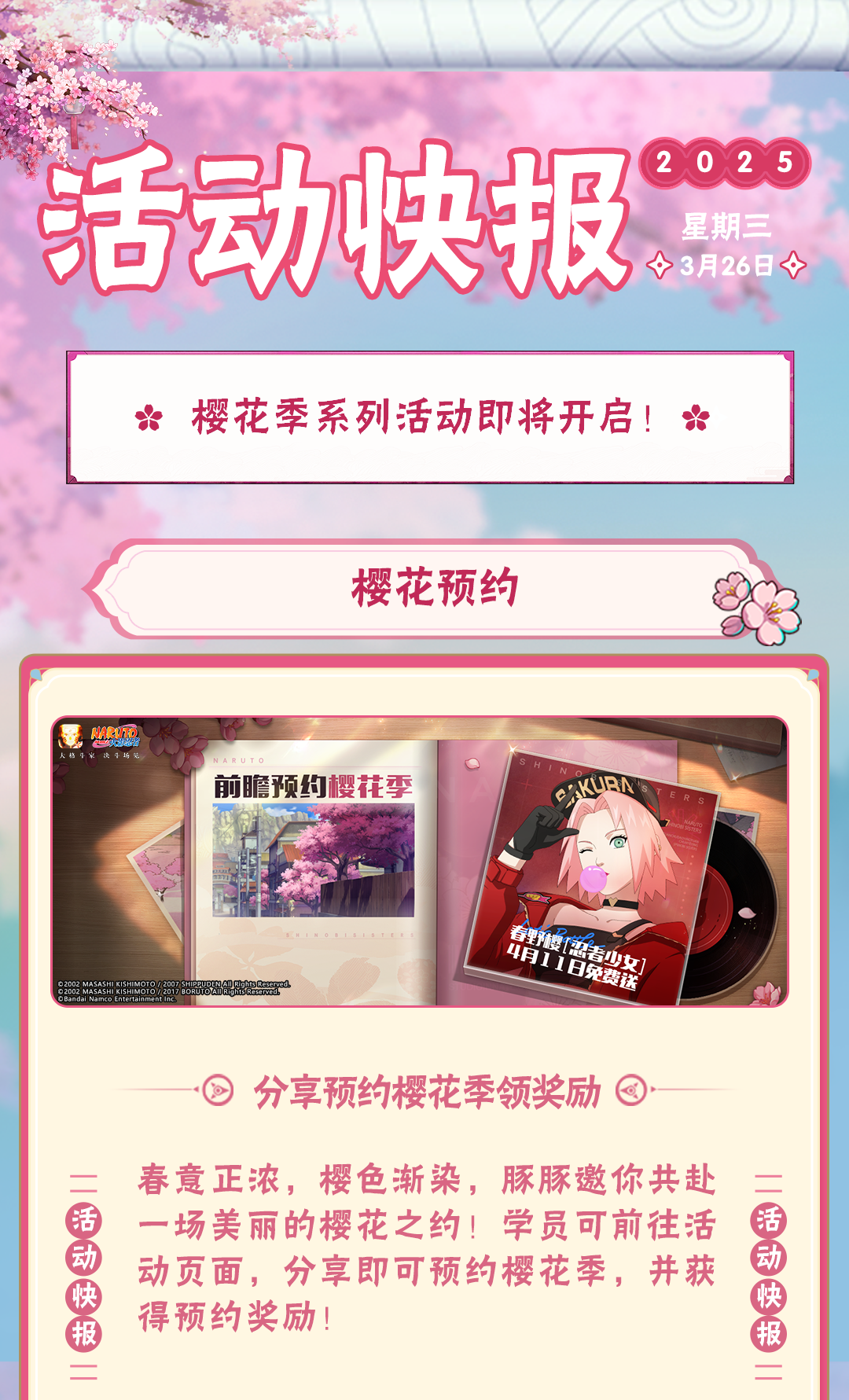 豚豚还有丰厚的福利要送给学员们!3月14日-3月27日,关注火影忍者公众号即可一键领取豚豚准备的好礼,完成每日任务还能获得抽奖次数,参与抽取58金币、忍玉、轮回石等奖励。学员们千万别错过!