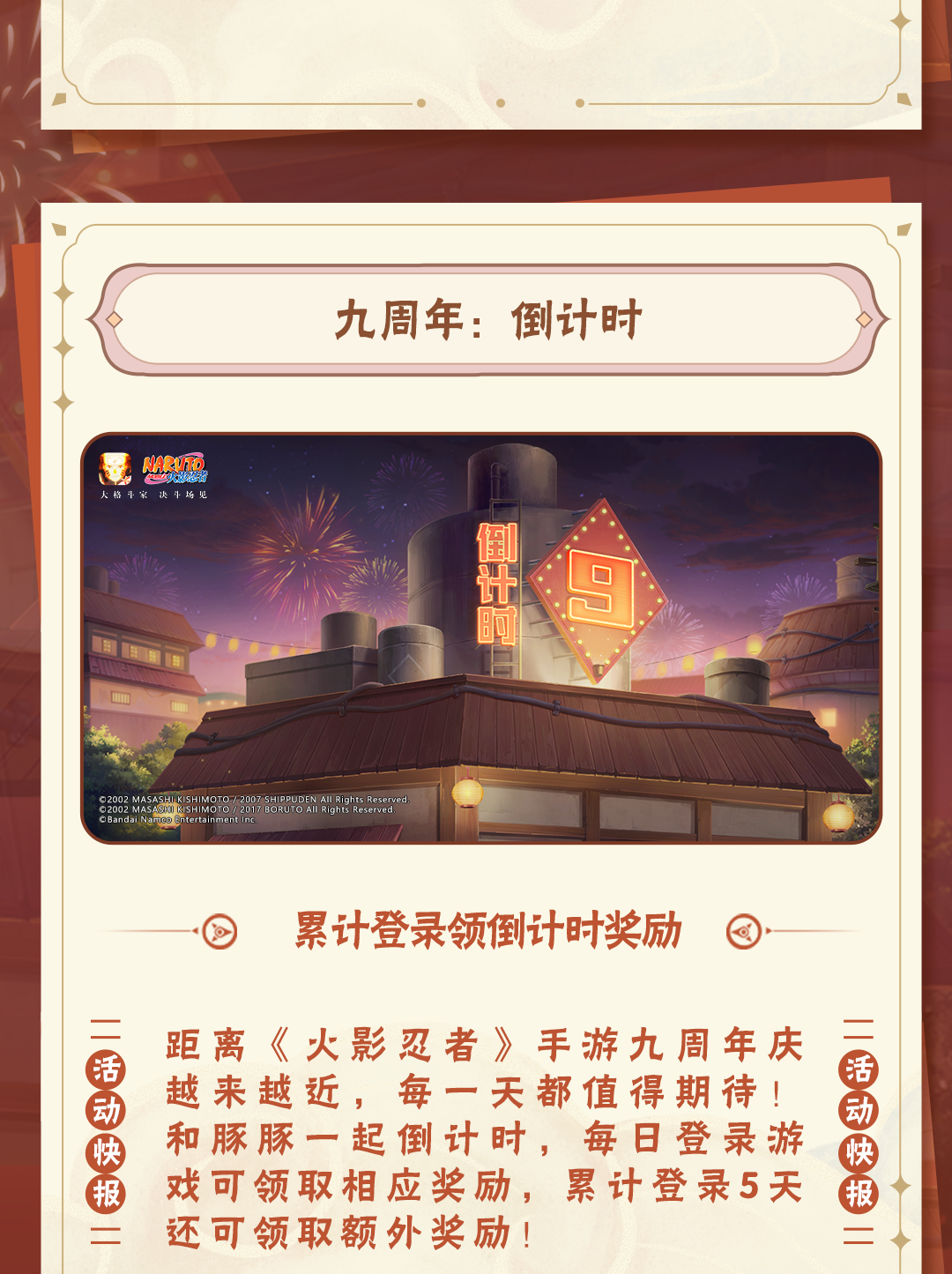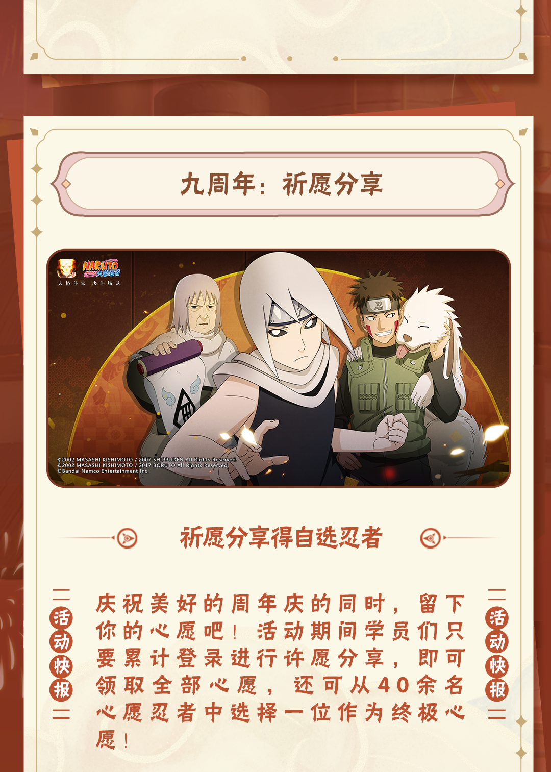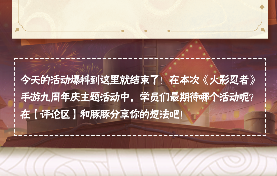 《火影忍者》手游九周年重燃盛典将于2025年1月10日至1月12日在武汉·华中科技大学光谷体育馆举行。年度总决赛观赛资格将于12月27日-12月30日正式开启报名,学员们可以点击下方卡片进入【火影忍者手游情报社】线下站预约报名!