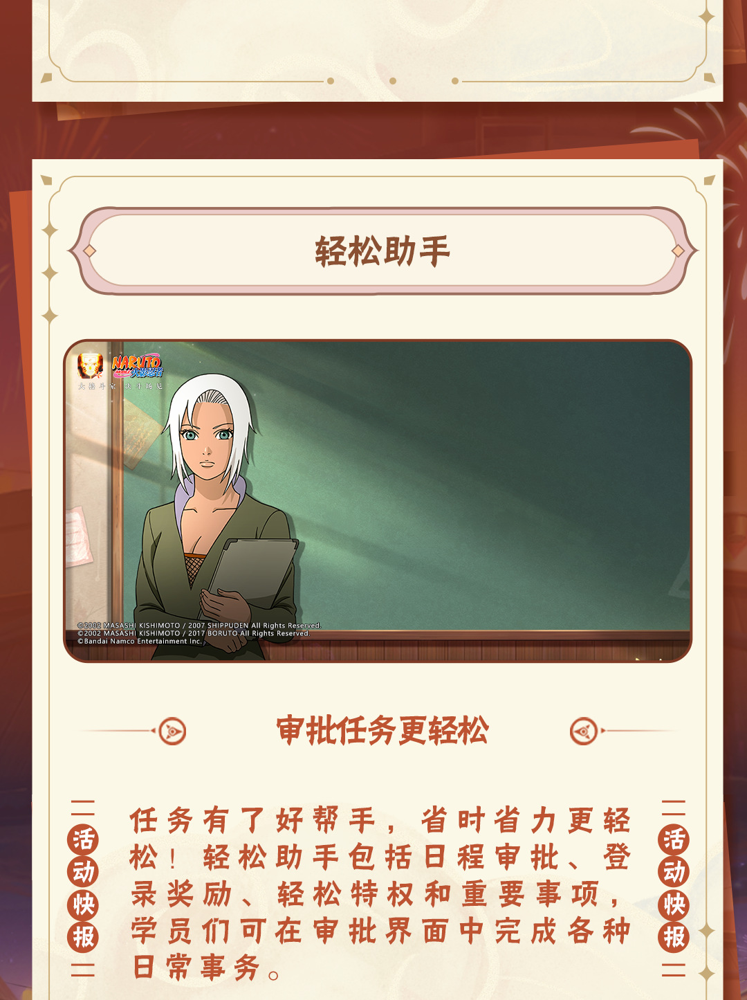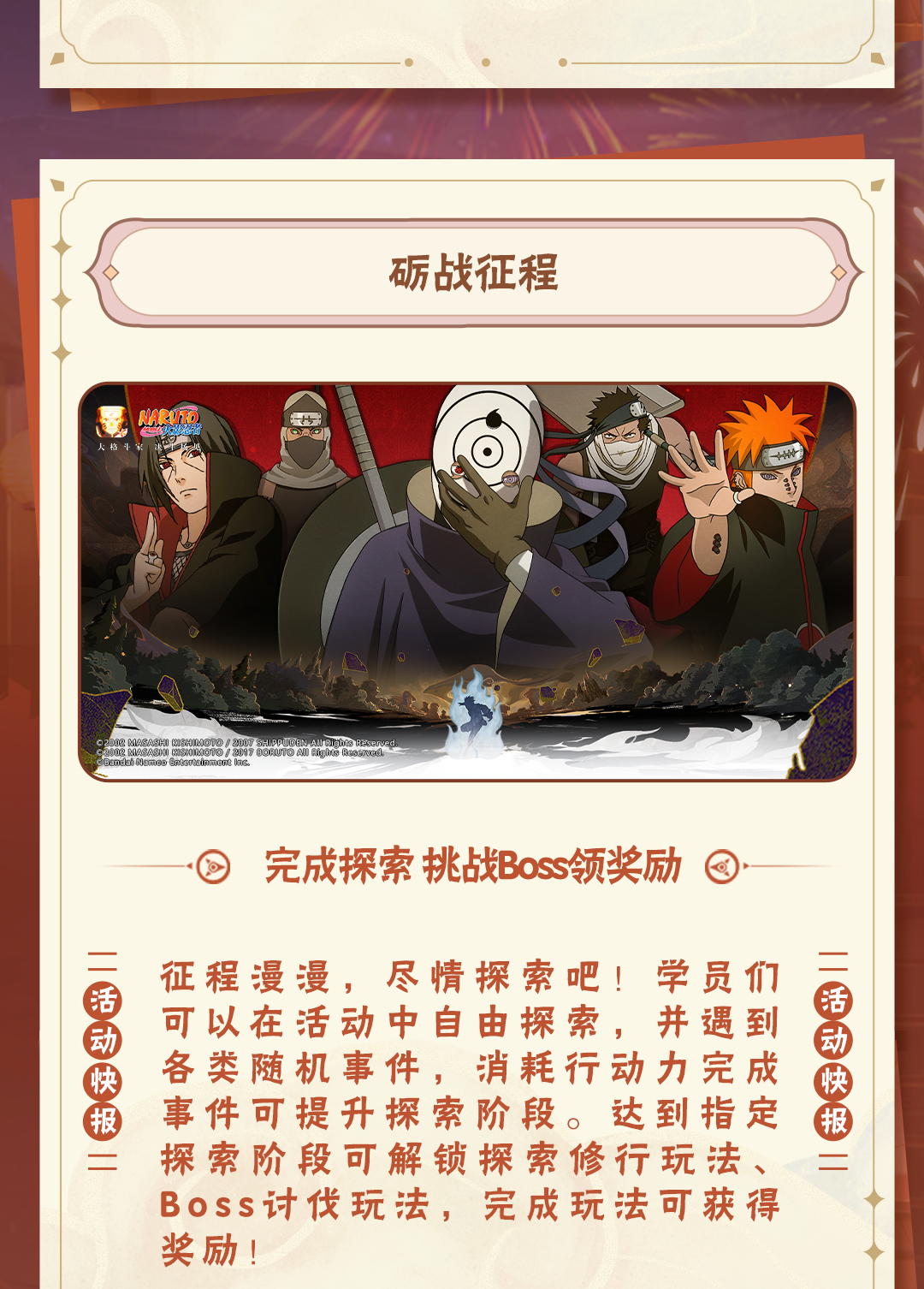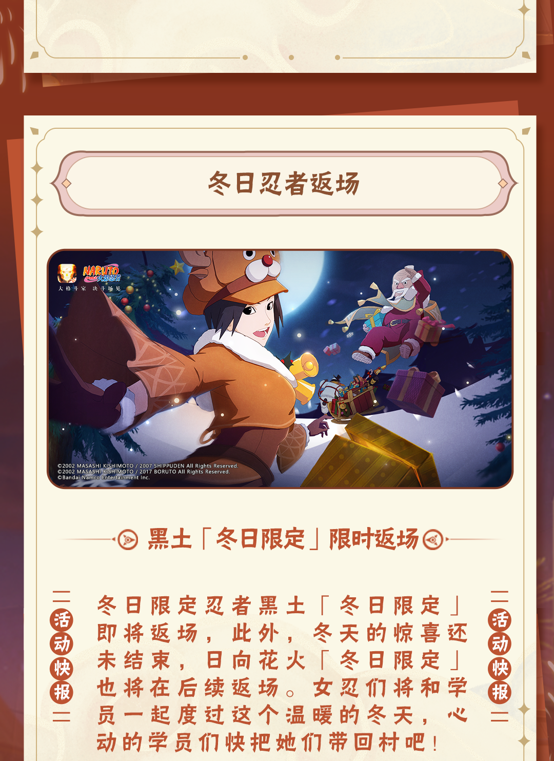 《火影忍者》手游九周年重燃盛典将于2025年1月10日至1月12日在武汉·华中科技大学光谷体育馆举行。年度总决赛观赛资格将于12月27日-12月30日正式开启报名,学员们可以点击下方卡片进入【火影忍者手游情报社】线下站预约报名!