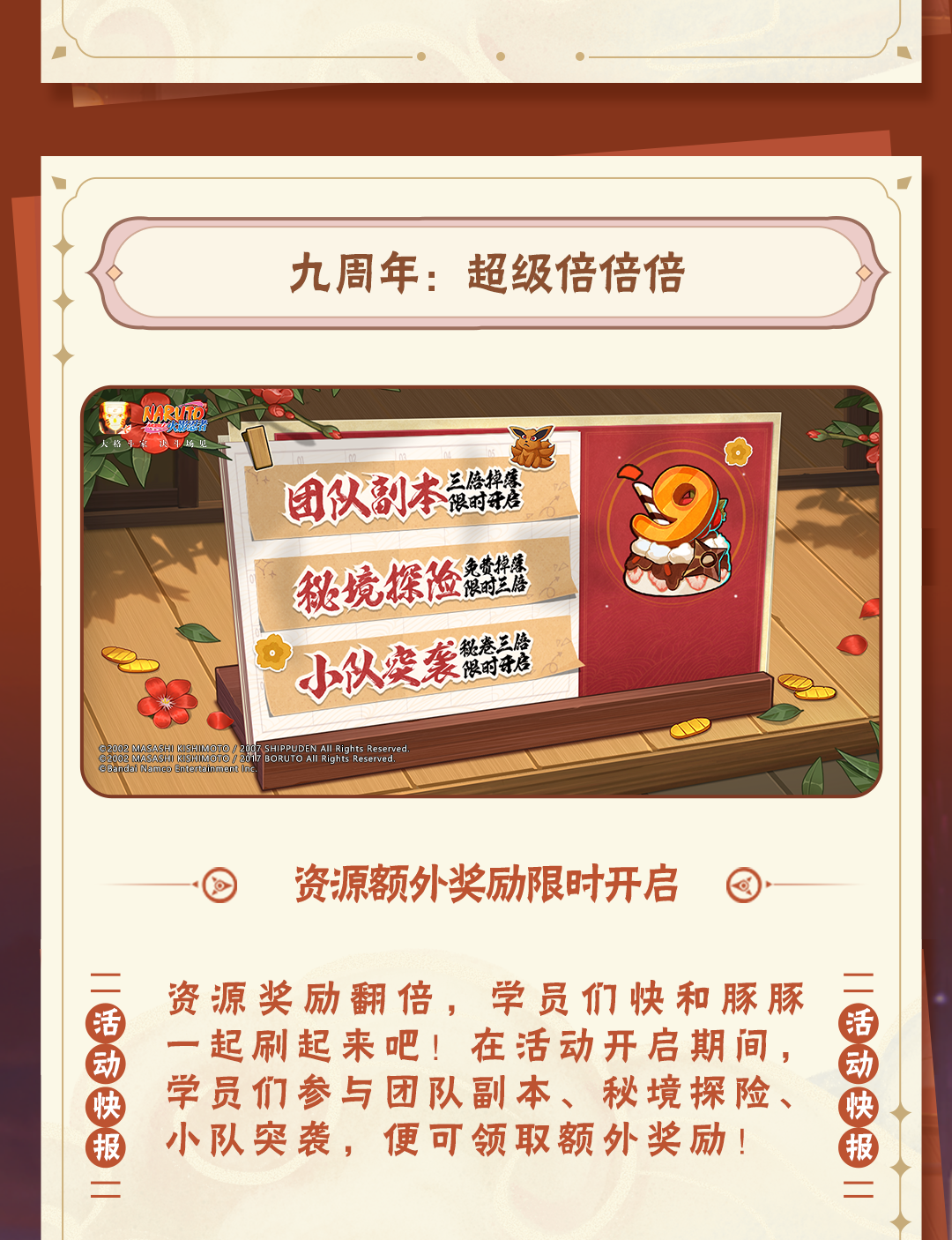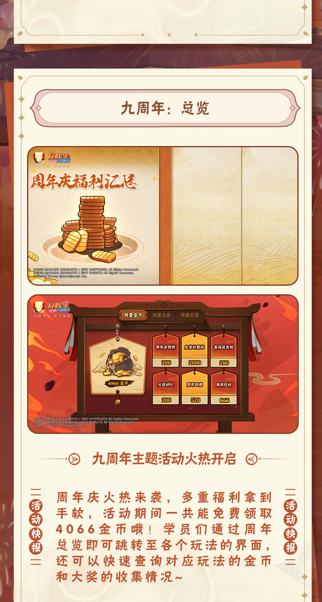 点击公众号菜单栏【豚豚福利】,参与火影忍者手游情报社活动,可领取金币、忍玉、随机忍者碎片等福利!