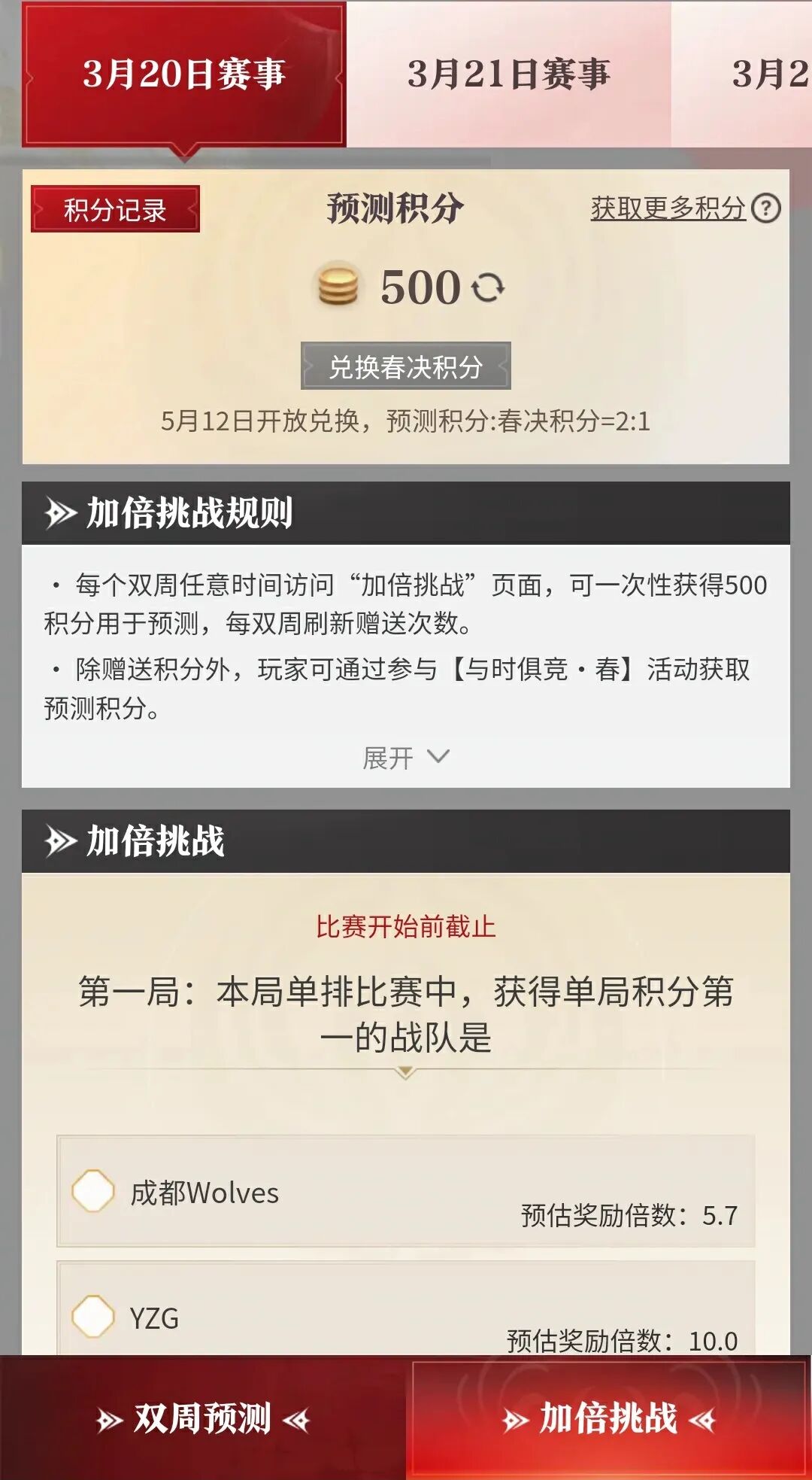 自3月20日起至3月23日,参与【加倍挑战】预测,答对题目可积攒积分,积分可兑换春泉宝箱任选礼*10。