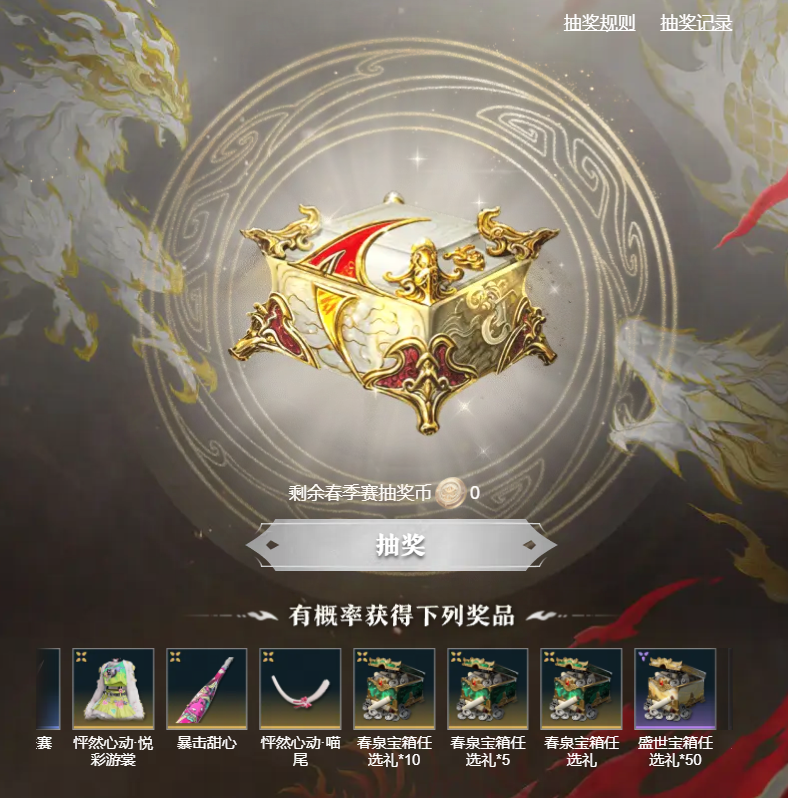 参与抽奖活动,还有机会获得春泉宝箱任选礼、盛世宝箱任选礼、沈妙极品时装【怦然心动·悦彩游裳】、联赛战旗等超多丰厚奖励。