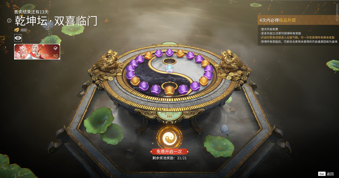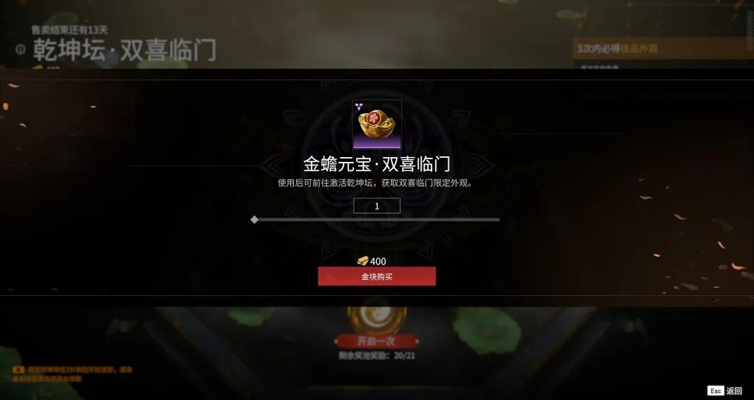 每次开启乾坤坛,需消耗一个【金蟾元宝·双喜临门】,每个售价400金块。