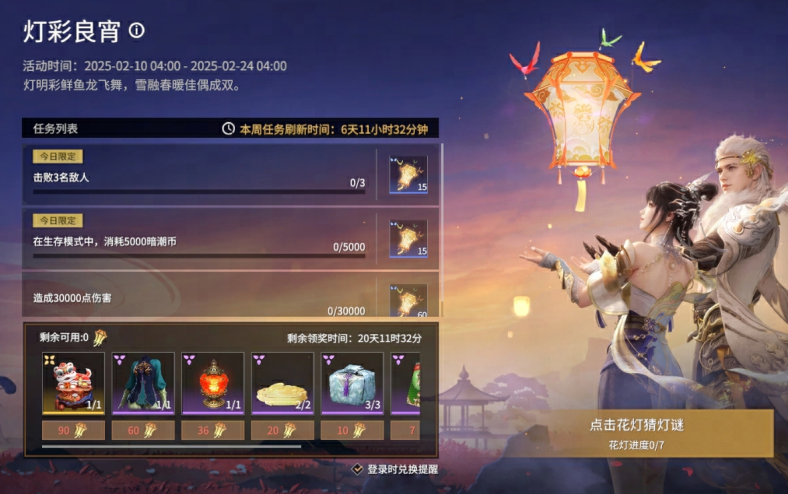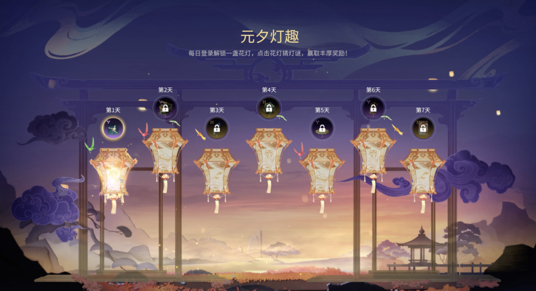 活动期间,每日登录可解锁1盏花灯,总计可解锁7盏,点击花灯进入灯谜答题界面,体验元宵节传统节目——猜灯谜,