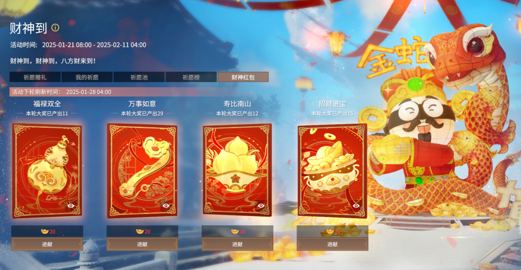 活动期间,完成活动任务,即可获得道具【剪春灯】,使用【剪春灯】兑换新春华灯、通用极品底座【吉祥狮】等奖励。