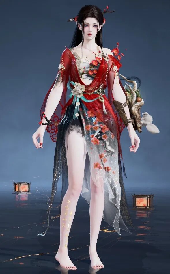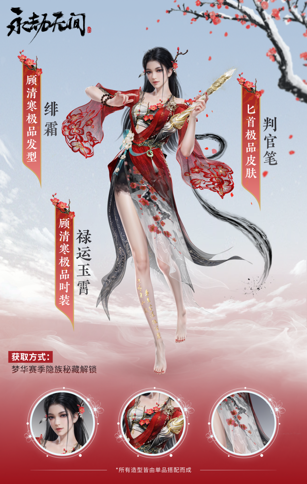 肩头、脚踝上的诗句是陆游的《卜算子·咏梅》,裙摆上更题有《警世贤文》中的名句——“宝剑锋从磨砺出,梅花香自苦寒来”。激励学子奋发上进,也祝福各位在校的劫友们思如泉涌、金榜题名。