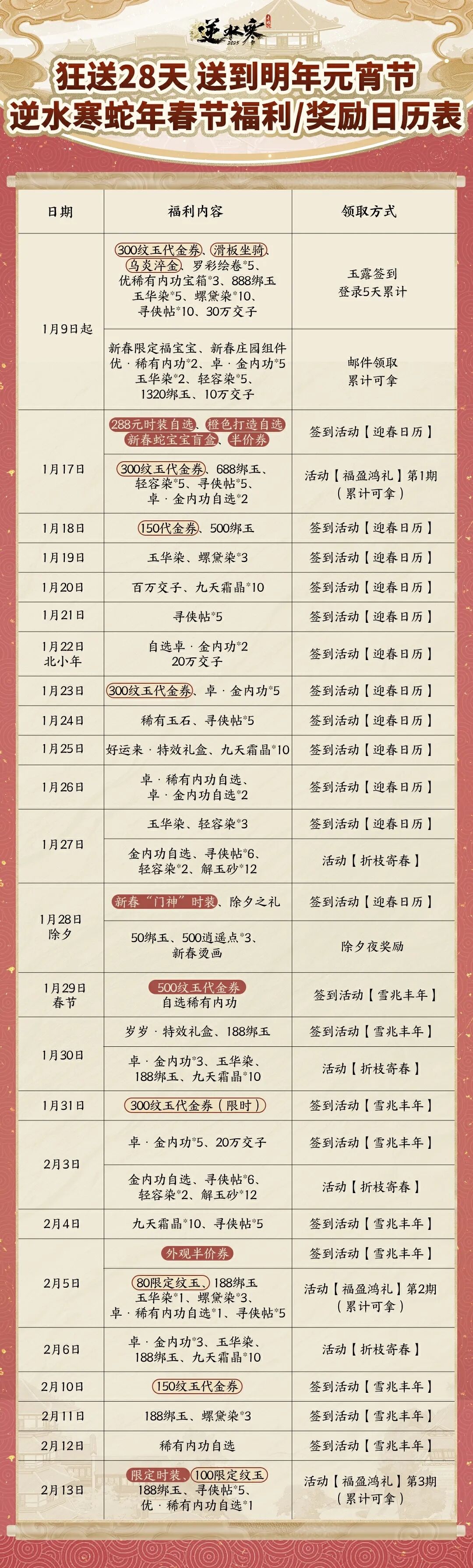 重磅福利10:玩福盈鸿礼,拿返利礼物。春节期间,福盈鸿礼全新福利活动上线!打卡福盈鸿礼中的小任务,比如登录游戏、日课点达到100、参与春节新玩法等,就可以轻松获得300纹玉代金券、自选优稀有内功、188限定纹玉、玩法专属时装(时装2月13日可获取)等丰厚奖励。