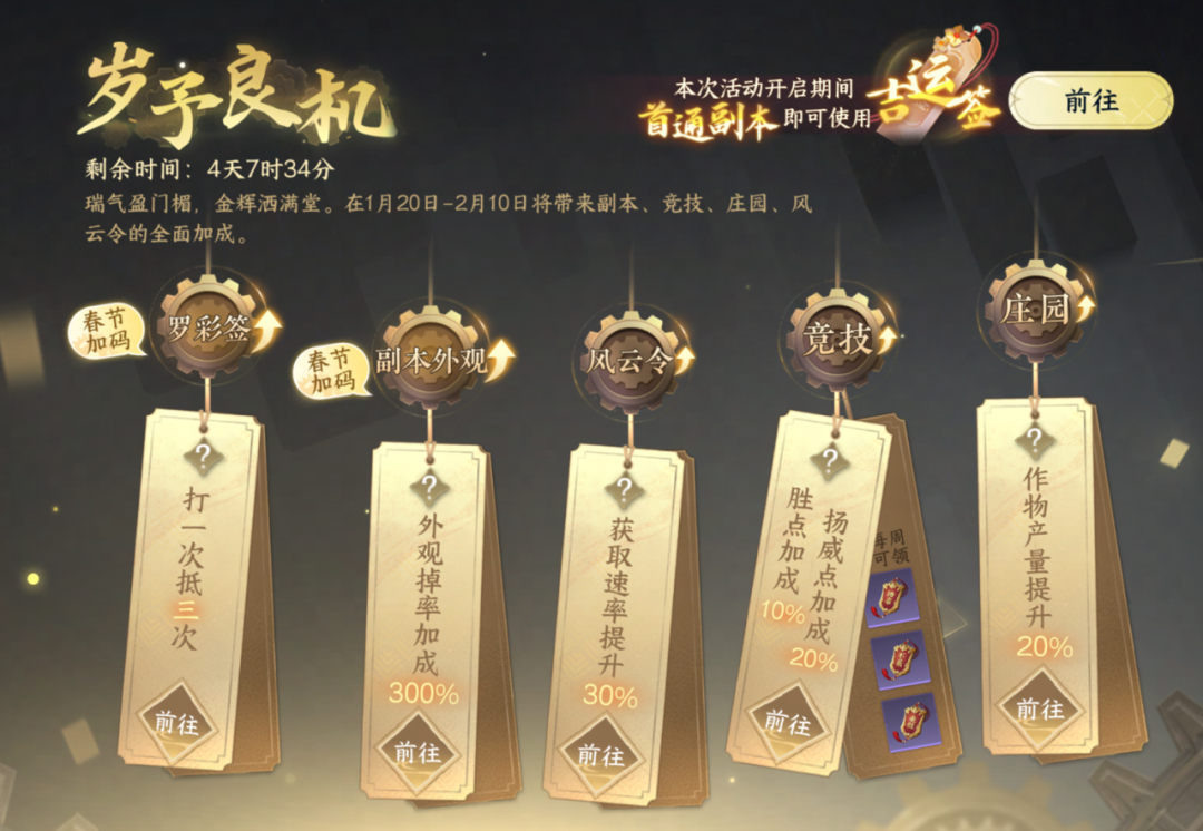 瑞气盈门楣,金辉洒满堂。在1月20日-2月10日将带来副本、竞技、庄园、风云令的全面加成。 本次春节加码罗彩签打一抵三,副本外观爆率300%。