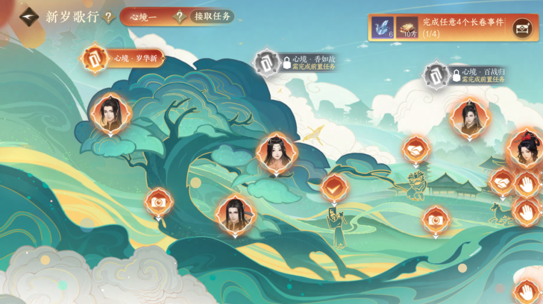 各位同门可通过【山河春晓】活动界面,点击“新岁歌行”,进入长卷界面,领取任务;亦可通过任务-正传-心境界面进行接取。