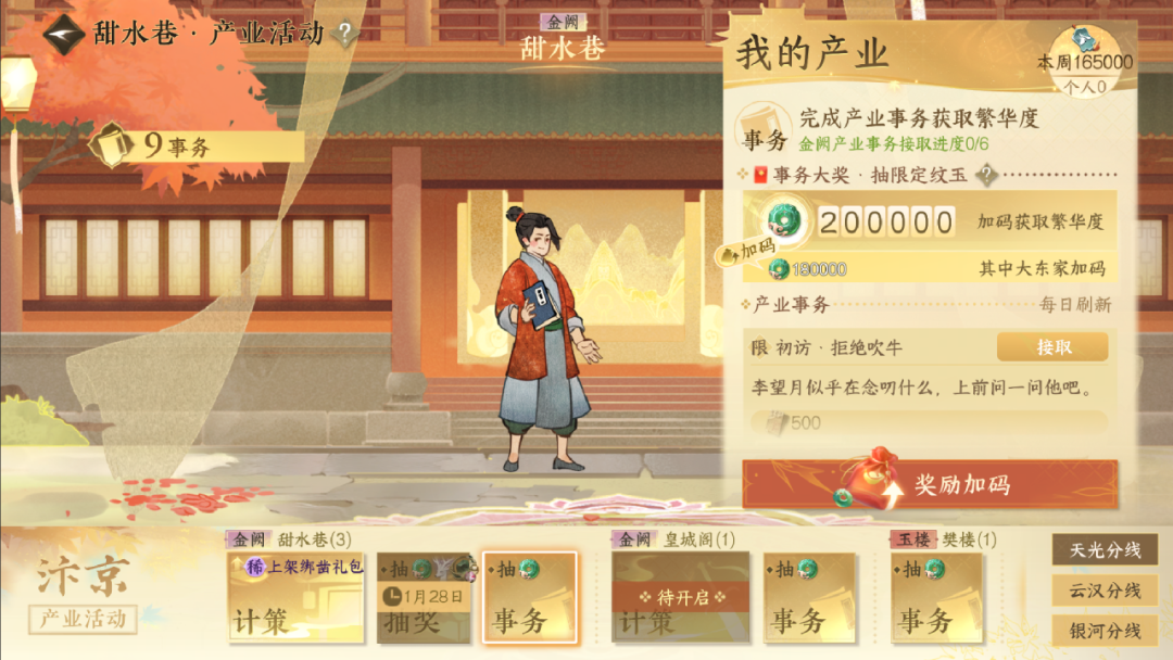 产业·金阙、玉楼每日将自动发布产业事务,完成可获得铜钱、交子。