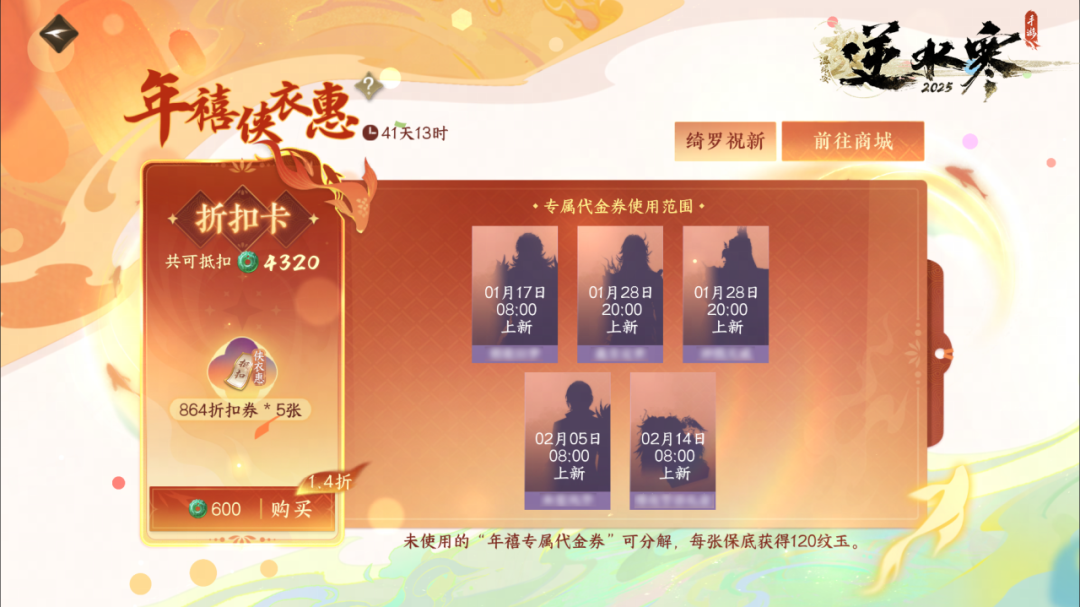 重磅福利13:春节版本上线后,将送出多张半价券和代金券。