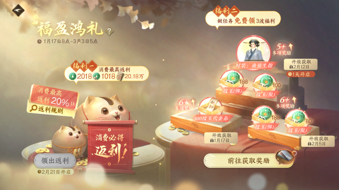 消费分为三个阶段,每个阶段对应不同比例返利,活动最高返利可达2018纹玉/1018纹玉(限)/20.18万交子,返利将于2月21日更新后开放领取。