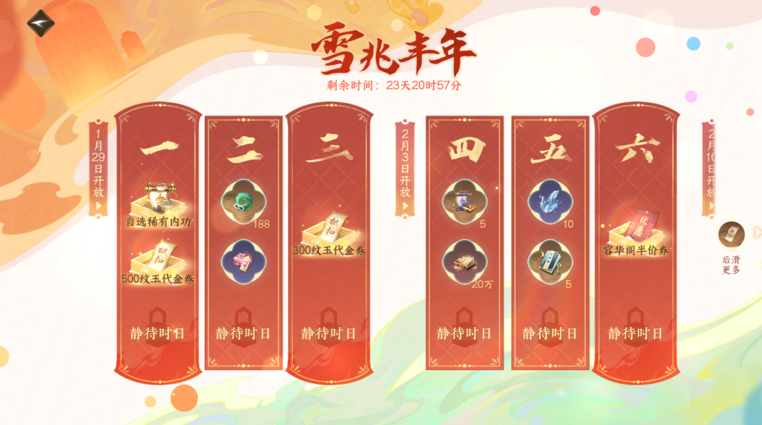 同时还有好运来·特效礼盒、自选稀有内功、百万交子、玉华染、螺黛染、轻容染、九天霜晶和绑玉等好礼。