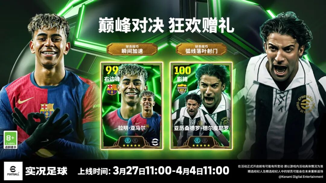 双增能史诗高光亚马尔将通过【巅峰对决 狂欢赠礼】首次登场!除此之外,你还将有机会获得双增能史诗高光托蒂、德尔皮耶罗、阿尔巴,增能史诗高光贝尔、巴乔、塞尔吉奥、罗布森。想要补强球队的玩家们,千万不要错过此次活动!