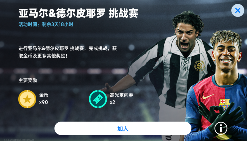 战胜【亚马尔&德尔皮耶罗 挑战赛】中的对手,你将赢得【金币】和【高光定向券】作为奖励。完成更多阶段任务,可以获得更丰厚的奖励!你需要挑战多位强敌,才能成为最终的胜者!