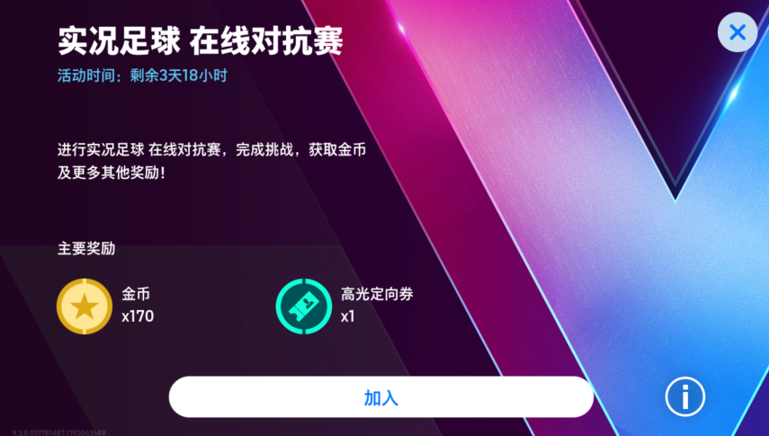 参与并完成【实况足球 在线对抗赛】,你将赢得【金币】和【高光定向券】作为参赛奖励。快来参加这场激烈的对抗吧!